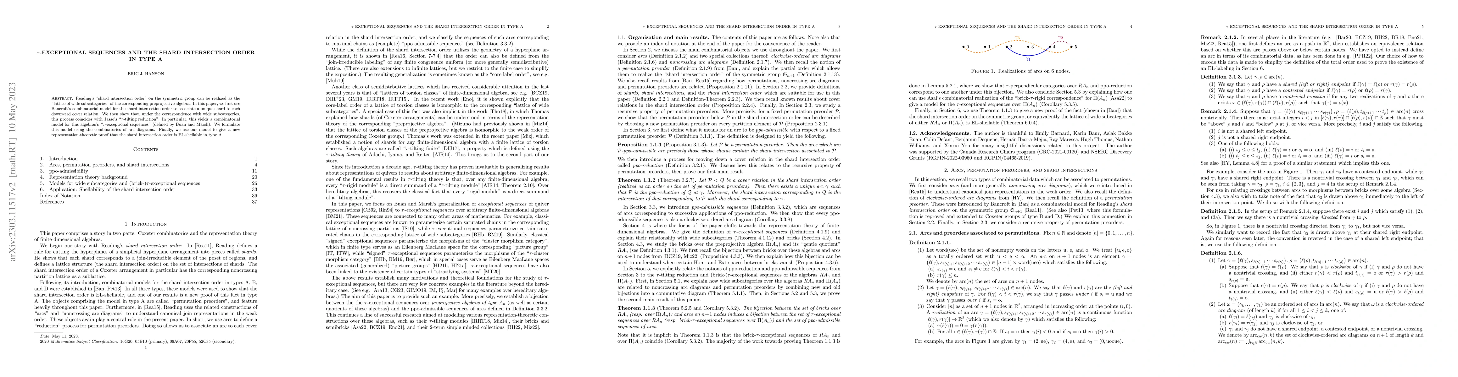 Reading's "shard intersection order" on the symmetric group can be realized as the "lattice of wide subcategories" of the corresponding preprojective algebra. In this paper, we first use Bancroft's combinatorial model for the shard intersection order to associate a unique shard to each downward cover relation. We then show that, under the correspondence with wide subcategories, this process coincides with Jasso's "$\tau$-tilting reduction". In particular, this yields a combinatorial model for this algebras's $\tau$-exceptional sequences" (defined by Buan and Marsh). We formulate this model using the combinatorics of arc diagrams. Finally, we use our model to give a new representation-theoretic proof that the shard intersection order is EL-shellable in type A.