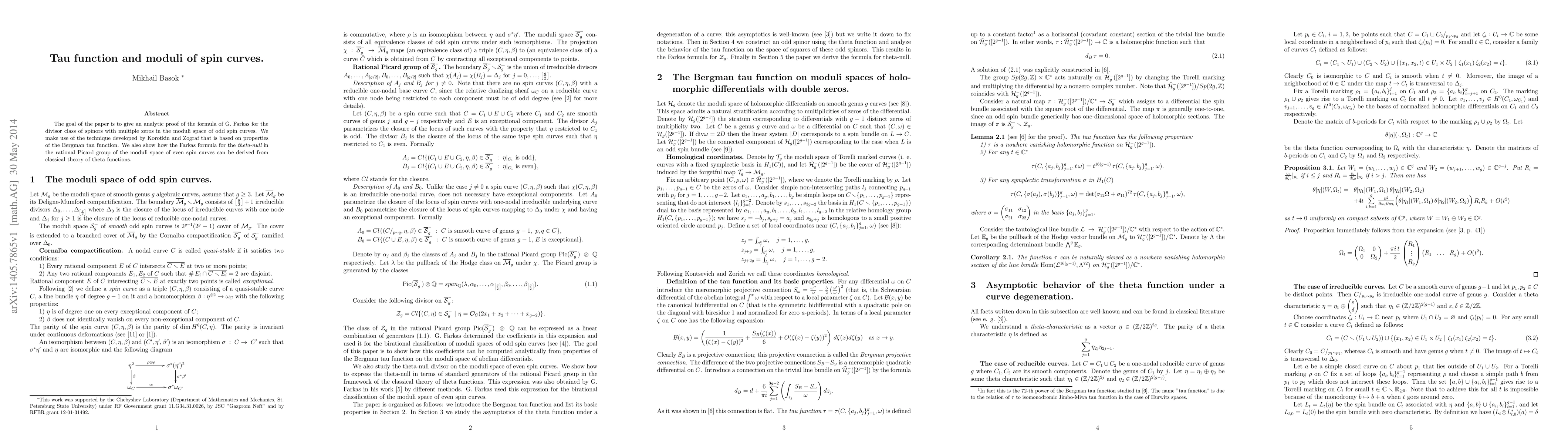The goal of the paper is to give an analytic proof of the formula of G. Farkas for the divisor class of spinors with multiple zeros in the moduli space of odd spin curves. We make use of the technique developed by Korotkin and Zograf that is based on properties of the Bergman tau function. We also show how the Farkas formula for the {\it theta-null} in the rational Picard group of the moduli space of even spin curves can be derived from classical theory of theta functions.