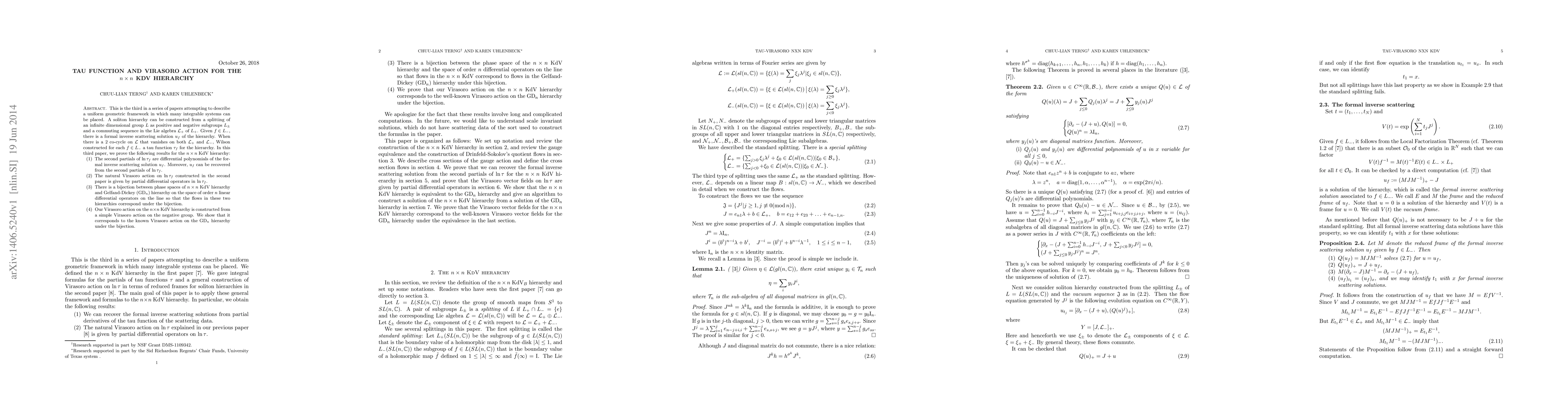 This is the third in a series of papers attempting to describe a uniform geometric framework in which many integrable systems can be placed. A soliton hierarchy can be constructed from a splitting of an infinite dimensional group $L$ as positive and negative subgroups L_+, L_- and a commuting sequence in the Lie algebra of L_+. Given f in L_-, there is a formal inverse scattering solution u_f of the hierarchy. When there is a 2 co-cycle that vanishes on both subalgebras of L_+ and L_-, Wilson constructed for each f in L_- a tau function tau_f for the hierarchy. In this third paper, we prove the following results for the nxn KdV hierarchy: (1) The second partials of ln(tau_f) are differential polynomials of the formal inverse scattering solution u_f. Moreover, u_f can be recovered from the second partials of ln(tau_f). (2) The natural Virasoro action on ln(tau_f) constructed in the second paper is given by partial differential operators in ln(tau_f). (3) There is a bijection between phase spaces of the nxn KdV hierarchy and the Gelfand-Dickey (GD_n) hierarchy on the space of order n linear differential operators on the line so that the flows in these two hierarchies correspond under the bijection. (4) Our Virasoro action on the nxn KdV hierarchy is constructed from a simple Virasoro action on the negative group. We show that it corresponds to the known Virasoro action on the GD_n hierarchy under the bijection.