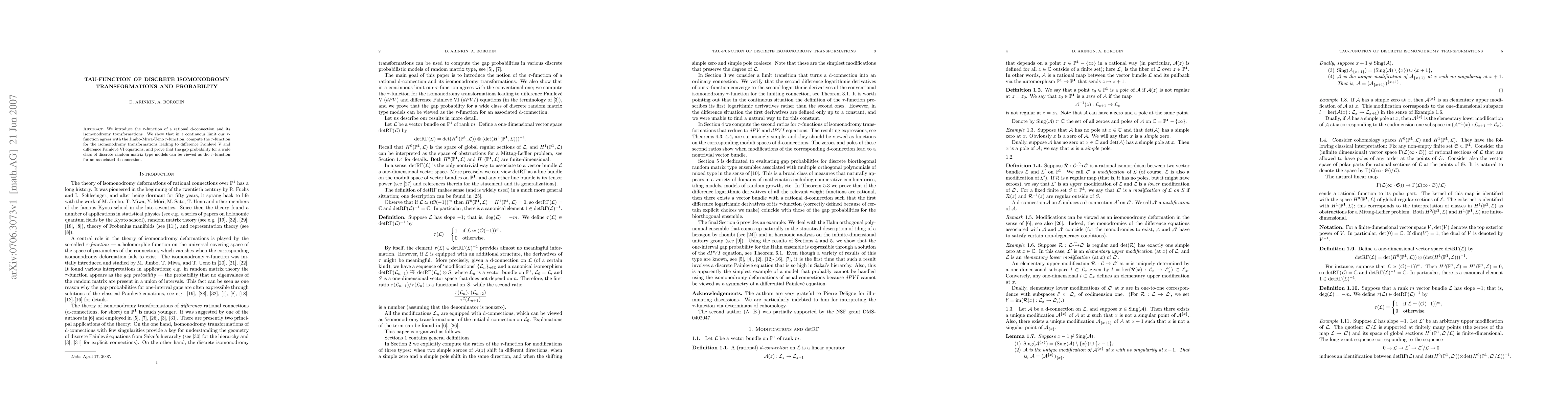 This paper introduces the tau-function for rational d-connections and their isomonodromy transformations, showing it aligns with the Jimbo-Miwa-Ueno tau-function in a continuous limit. It computes the tau-function for specific isomonodromy transformations and links the gap probability in discrete random matrix models to the tau-function of an associated d-connection.