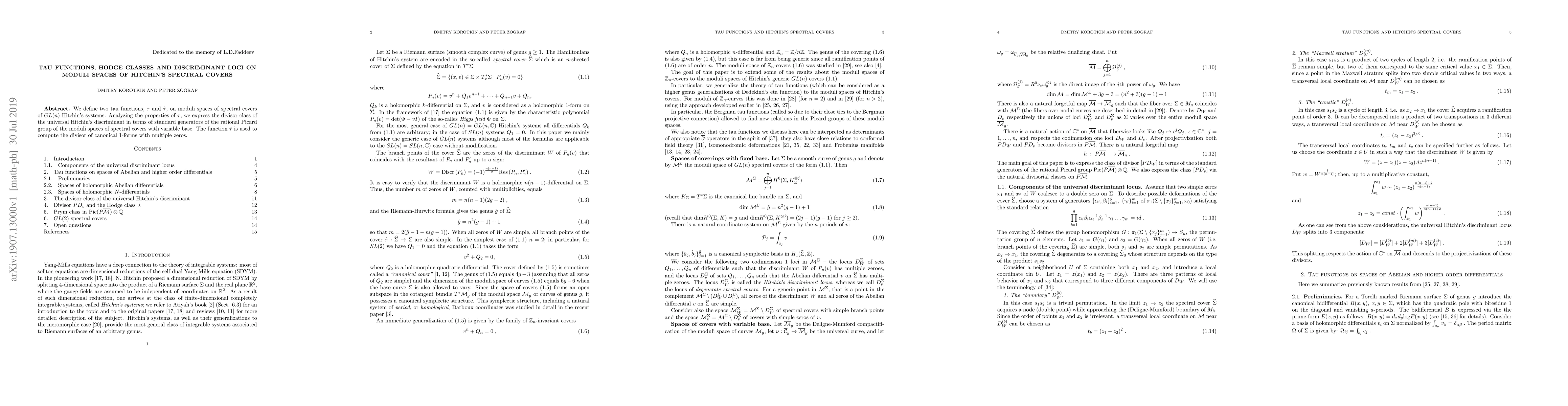 We define two tau functions, $\tau$ and $\hat{\tau}$ , on moduli spaces of spectral covers of $GL(n)$ Hitchin's systems. Analyzing the properties of $\tau$, we express the divisor class of the universal Hitchin's discriminant in terms of standard generators of the rational Picard group of the moduli spaces of spectral covers with variable base. The function $\hat{\tau}$ is used to compute the divisor of canonical 1-forms with multiple zeros.