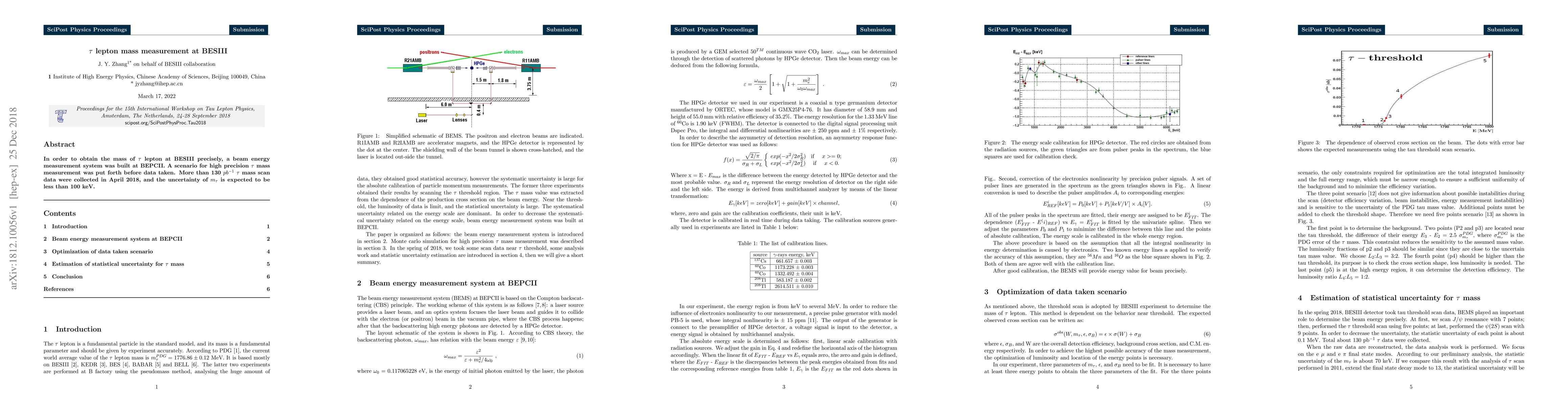 The BESIII experiment at BEPCII developed a precise beam energy measurement system to accurately determine the mass of the $\tau$ lepton. With over 130 pb$^{-1}$ of data collected in April 2018, the uncertainty in the $\tau$ lepton mass measurement is projected to be less than 100 keV.