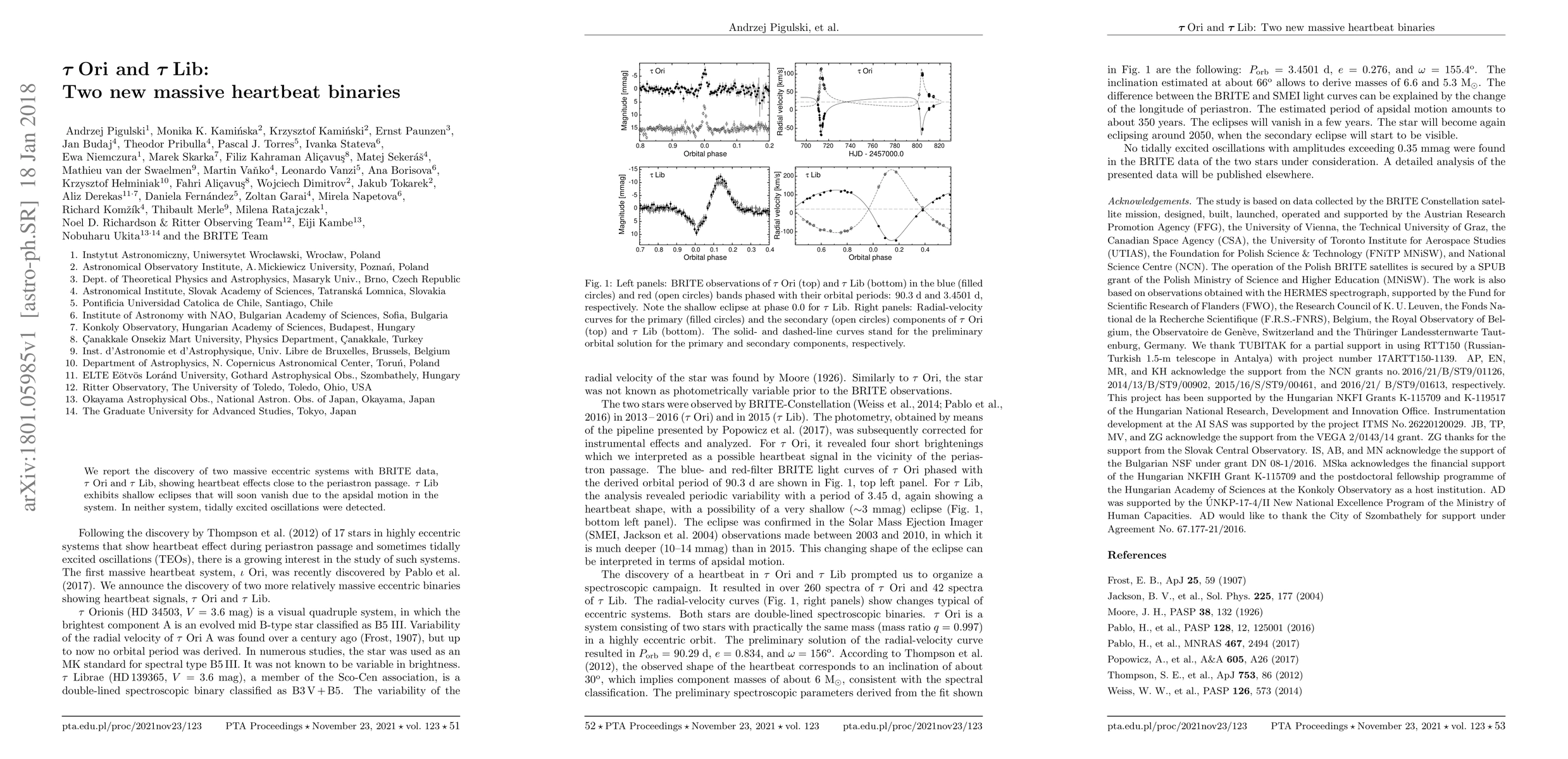 We report the discovery of two massive eccentric systems with BRITE data, $\tau$ Ori and $\tau$ Lib, showing heartbeat effects close to the periastron passage. $\tau$ Lib exhibits shallow eclipses that will soon vanish due to the apsidal motion in the system. In neither system, tidally excited oscillations were detected.