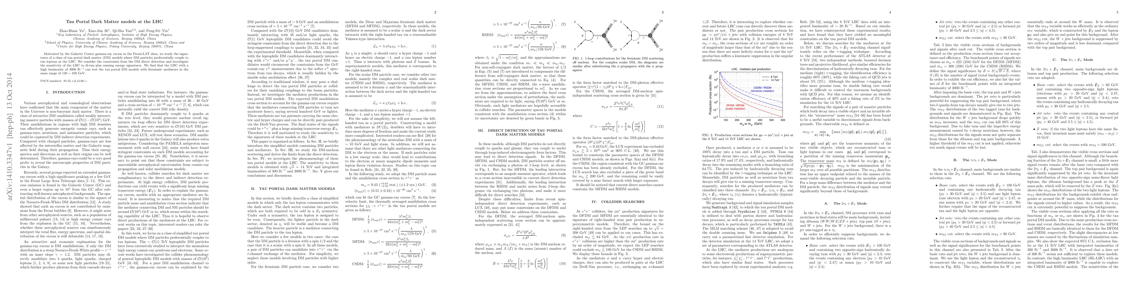 Motivated by the Galactic Center gamma-ray excess in the Fermi-LAT data, we study the signatures of a class of tau portal dark matter (DM) models where DM particles preferentially couple to tau leptons at the LHC. We consider the constraints from the DM direct detection and investigate the sensitivity of the LHC to di-tau plus missing energy signatures. We find that the LHC with a high luminosity of 3000 fb$^{-1}$ can test the tau portal DM models with fermionic mediators in the mass range of $120\sim450$ GeV.