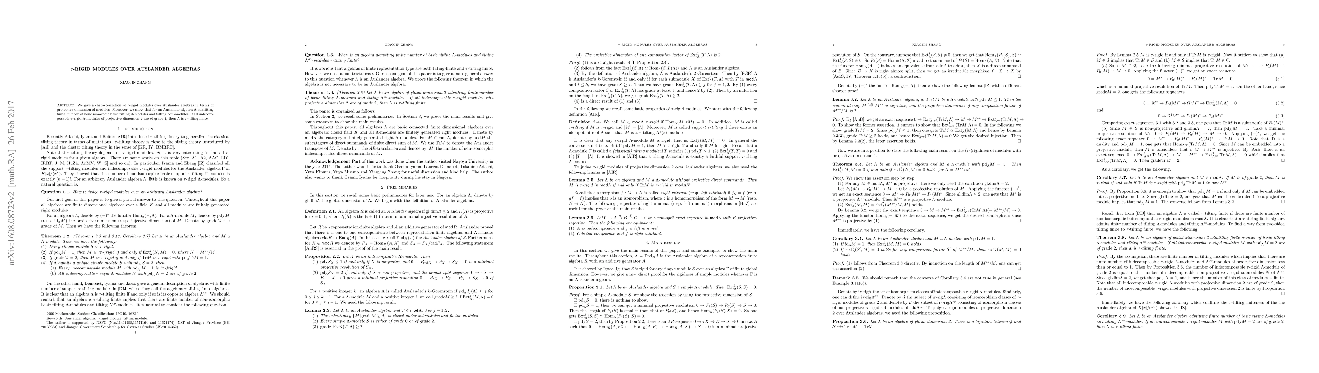 Summary: The paper characterizes $\tau$-rigid modules over Auslander algebras in terms of projective dimensions, and proves that for such algebras with limited non-isomorphic basic tilting modules, $\Lambda$ is $\tau$-tilting finite if all indecomposable $\tau$-rigid modules of projective dimension $2$ are of grade $2$.