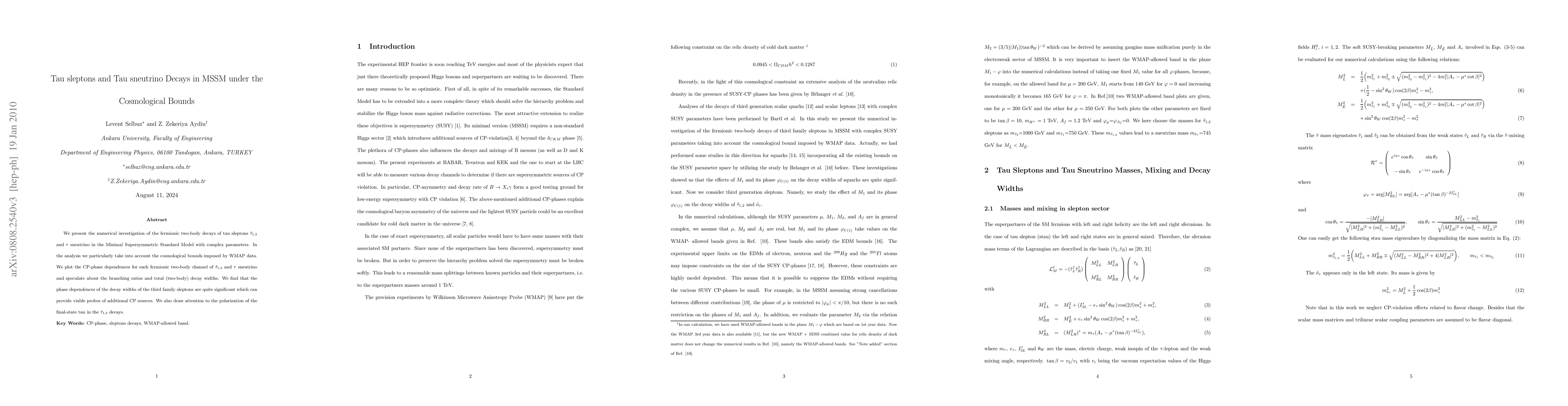 This paper investigates the decay characteristics of tau sleptons and tau sneutrino in the MSSM framework, considering cosmological constraints from WMAP data. It highlights significant CP-phase dependences in decay widths, suggesting potential for probing additional CP sources and noting the polarization effects in tau slepton decays.