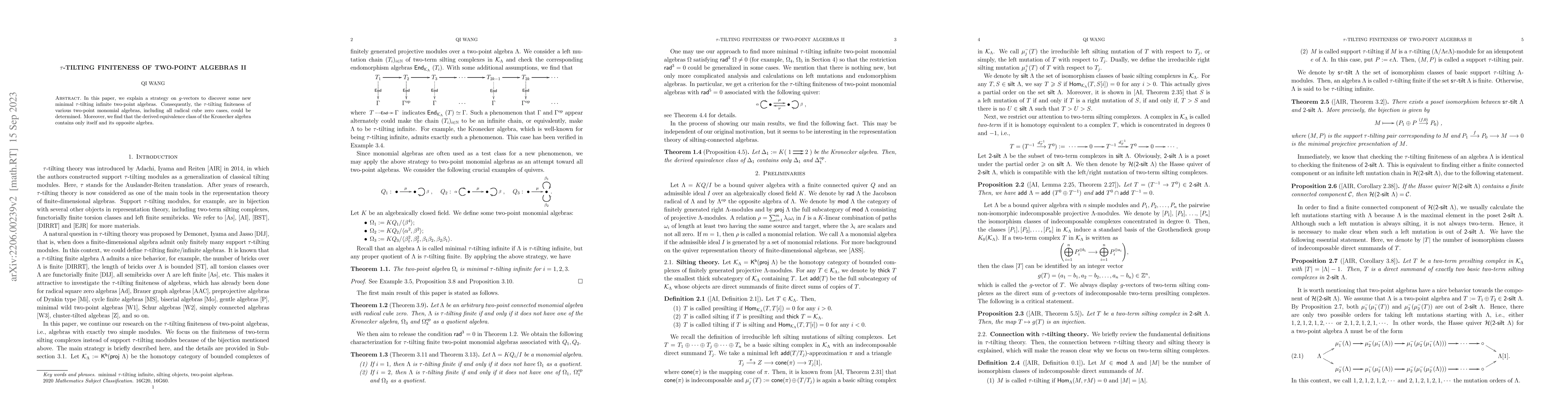 In this paper, we explain a strategy on $g$-vectors to discover some new minimal $\tau$-tilting infinite two-point algebras. Consequently, the $\tau$-tilting finiteness of various two-point monomial algebras, including all radical cube zero cases, could be determined. Moreover, we find that the derived equivalence class of the Kronecker algebra contains only itself and its opposite algebra.