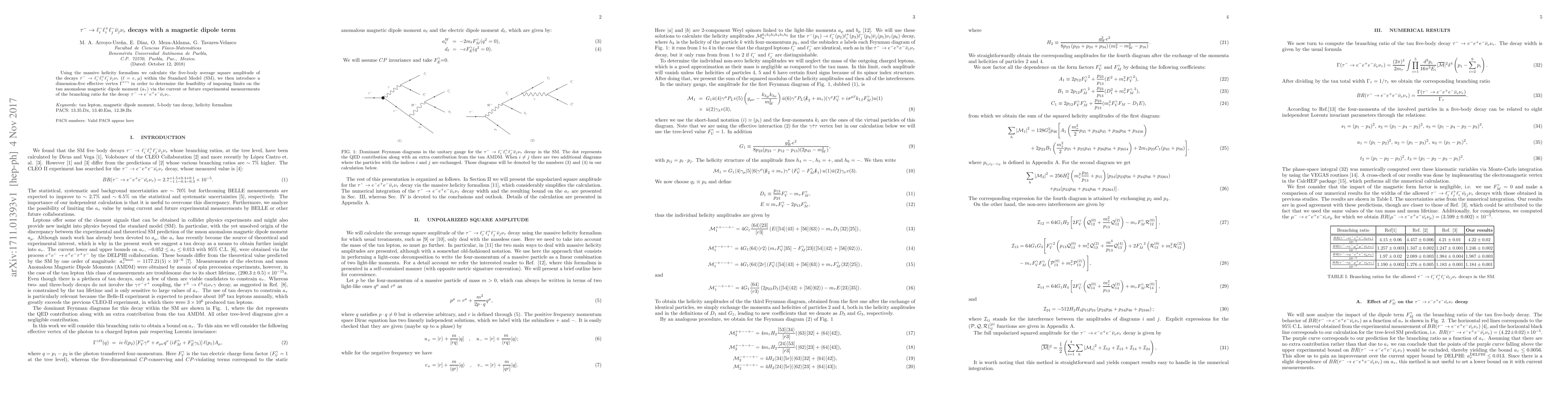 Using the massive helicity formalism we calculate the five-body average square amplitude of the decays $\tau^{-}\to \ell_i^{-} \ell_i^{+} \ell_j^{-} \bar{\nu}_{j} \nu_{\tau}$ $(\ell=e,\,\mu)$ within the Standard Model (SM), we then introduce a dimension-five effective vertex $\Gamma^{\tau\tau \gamma}$ in order to determine the feasibility of imposing limits on the tau anomalous magnetic dipole moment ($a_\tau$) via the current or future experimental measurements of the branching ratio for the decay $\tau^{-}\to e^{-} e^{+} e^{-} \bar{\nu}_{e} \nu_{\tau}$.
