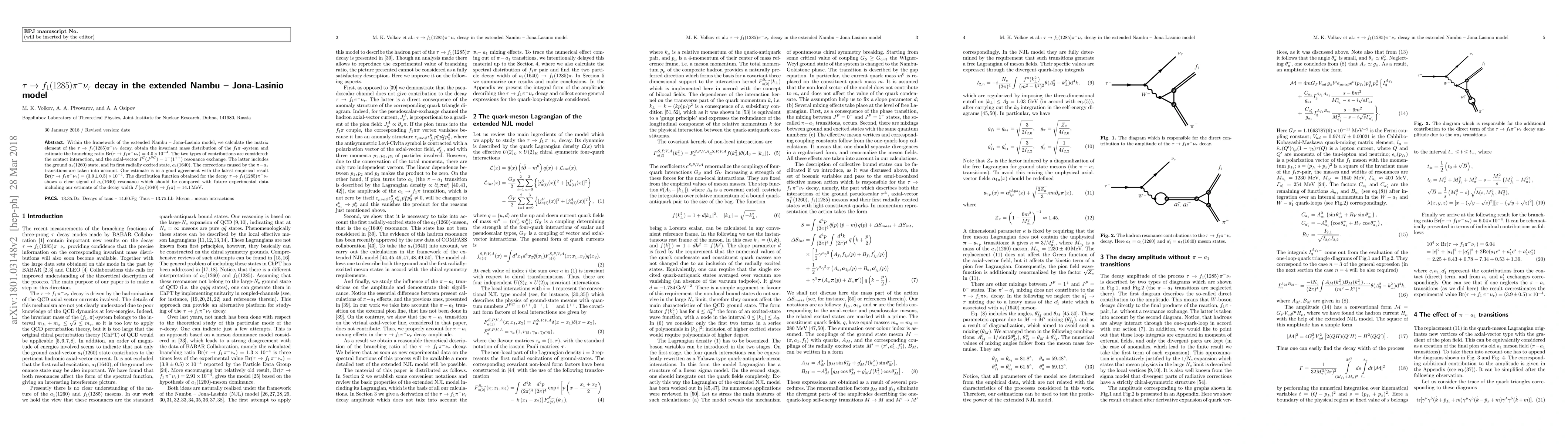 Within the framework of the extended Nambu -- Jona-Lasinio model, we calculate the matrix element of the $\tau \to f_1(1285) \pi^{-} \nu_{\tau}$ decay, obtain the invariant mass distribution of the $f_1\pi$ -system and estimate the branching ratio Br$(\tau \to f_1 \pi^{-}\nu_{\tau})=4.0\times 10^{-4}$. The two types of contributions are considered: the contact interaction, and the axial-vector $I^G(J^{PC})=1^-(1^{++})$ resonance exchange. The latter includes the ground $a_1(1260)$ state, and its first radially excited state, $a_1(1640)$. The corrections caused by the $\pi -a_1$ transitions are taken into account. Our estimate is in a good agreement with the latest empirical result Br$(\tau \to f_1 \pi^{-} \nu_{\tau})=(3.9\pm 0.5)\times 10^{-4}$. The distribution function obtained for the decay $\tau \to f_1(1285) \pi^{-} \nu_{\tau}$ shows a clear signal of $a_1(1640)$ resonance which should be compared with future experimental data including our estimate of the decay width $\Gamma (a_1(1640) \to f_1 \pi )=14.1\,\mbox{MeV}$.