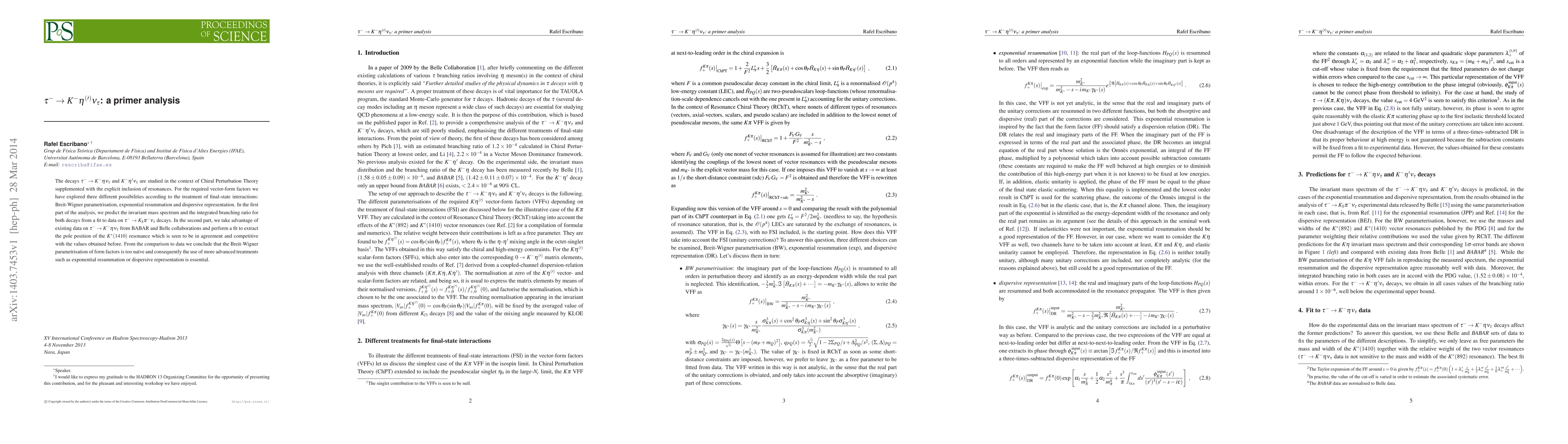 This paper analyzes the decays $\tau^-\to K^-\eta\nu_\tau$ and $K^-\eta^\prime\nu_\tau$ using Chiral Perturbation Theory, comparing three methods for vector-form factors. It concludes that Breit-Wigner parametrisation is insufficient, advocating for more advanced treatments like exponential resummation or dispersive representation.