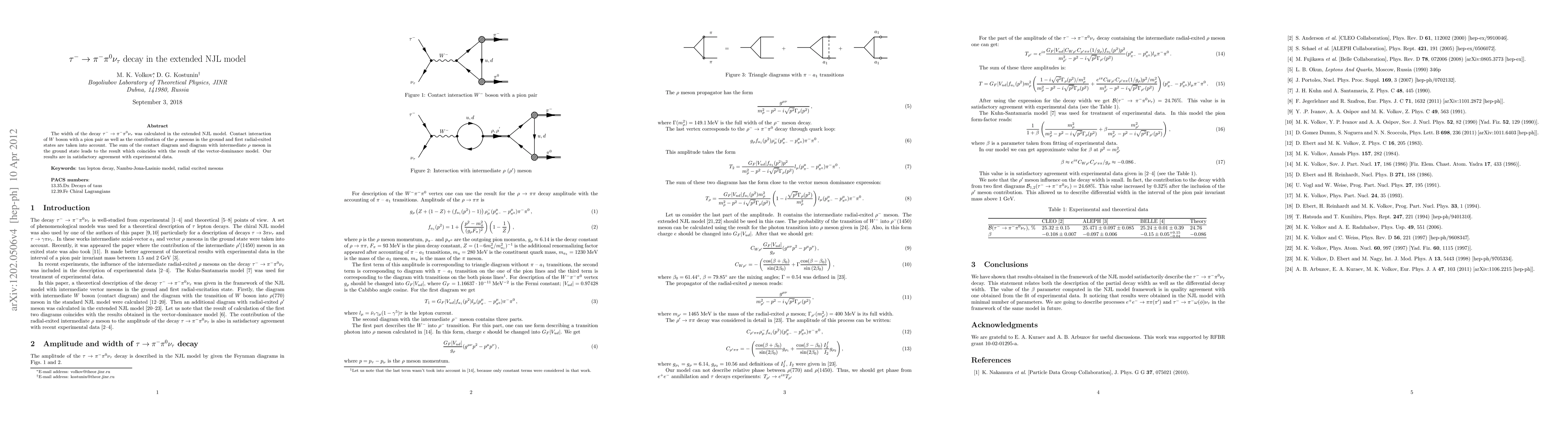 The extended NJL model was used to calculate the decay width of $\tau^{-} \to \pi^{-} \pi^{0} \nu_\tau$, incorporating $W$ boson contact interactions and $\rho$ meson contributions. The results align well with the vector-dominance model and experimental data.