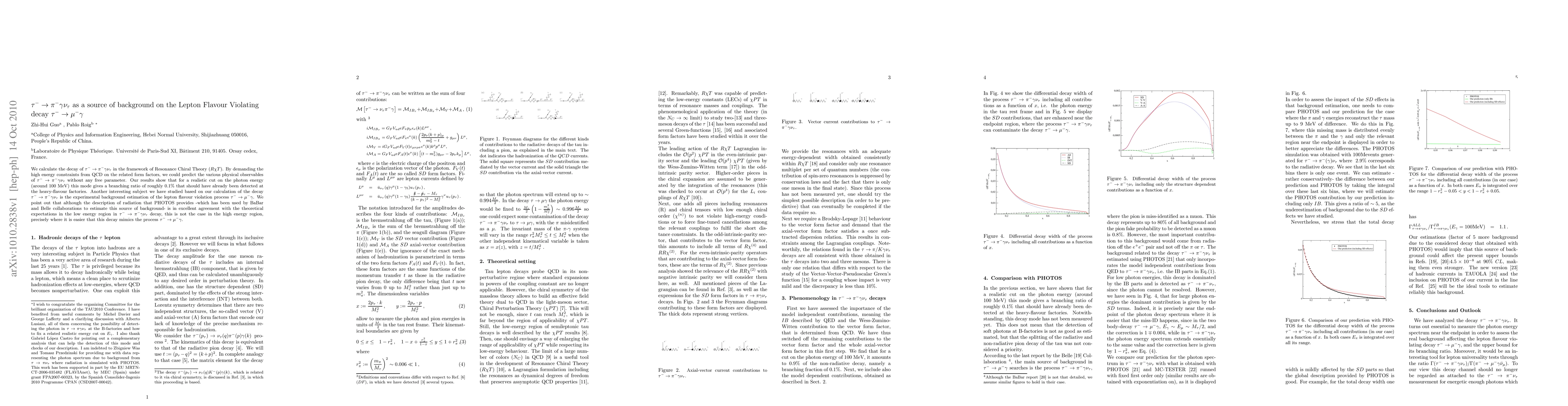 We calculate the decay of $\tau^-\to\pi^-\gamma\nu_\tau$ in the framework of Resonance Chiral Theory ($R\chi T$). By demanding the high energy constraints from QCD on the related form factors, we could predict the various physical observables of $\tau^-\to\pi^-\gamma\nu_\tau$ without any free parameter. Our results show that for a realistic cut on the photon energy (around $100$ MeV) this mode gives a branching ratio of roughly $0.1%$ that should have already been detected at the heavy-flavour factories. Another interesting subject we have studied based on our calculation of the decay $\tau^-\to\pi^-\gamma\nu_\tau$ is the experimental background estimation of the lepton flavour violation process $\tau^- \to \mu^- \gamma$. We point out that although the description of radiation that PHOTOS provides -which has been used by BaBar and Belle collaborations to estimate this source of background- is in excellent agreement with the theoretical expectations in the low energy region in $\tau^-\to\pi^-\gamma\nu_\tau$ decay, this is not the case in the high energy region, precisely where it is easier that this decay mimics the process $\tau^-\to\mu^-\gamma$.