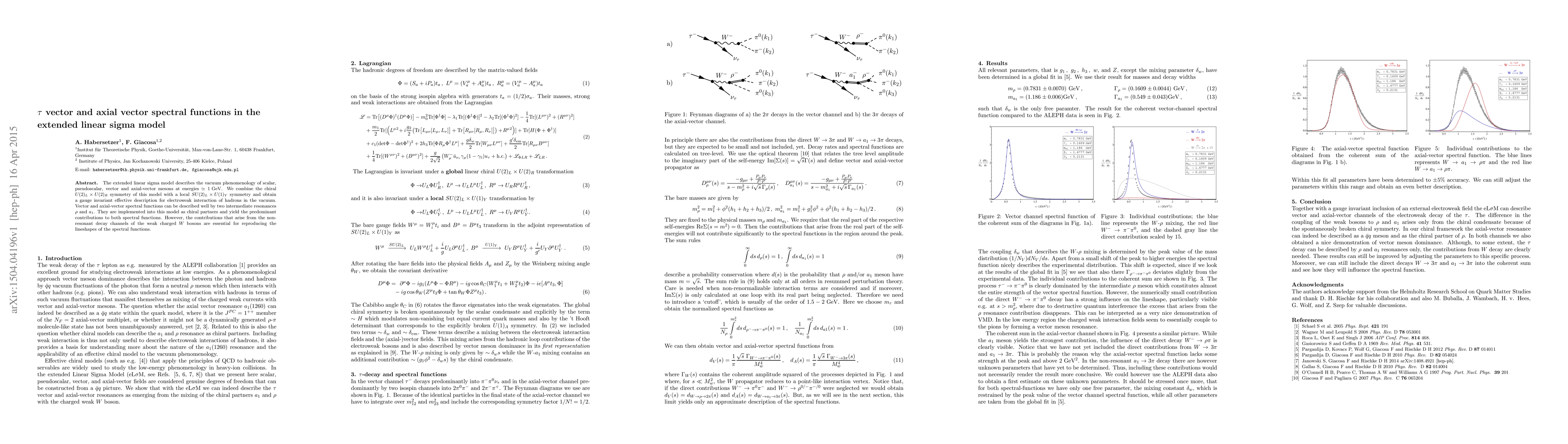 This paper explores the extended linear sigma model to describe the vacuum phenomenology of vector and axial-vector mesons, focusing on the electroweak interaction of hadrons. The model incorporates chiral and local symmetries, and identifies the \(\rho\) and \(a_1\) resonances as primary contributors to the vector and axial-vector spectral functions, with non-resonant decay channels of \(W\) bosons also playing a crucial role in shaping these functions.