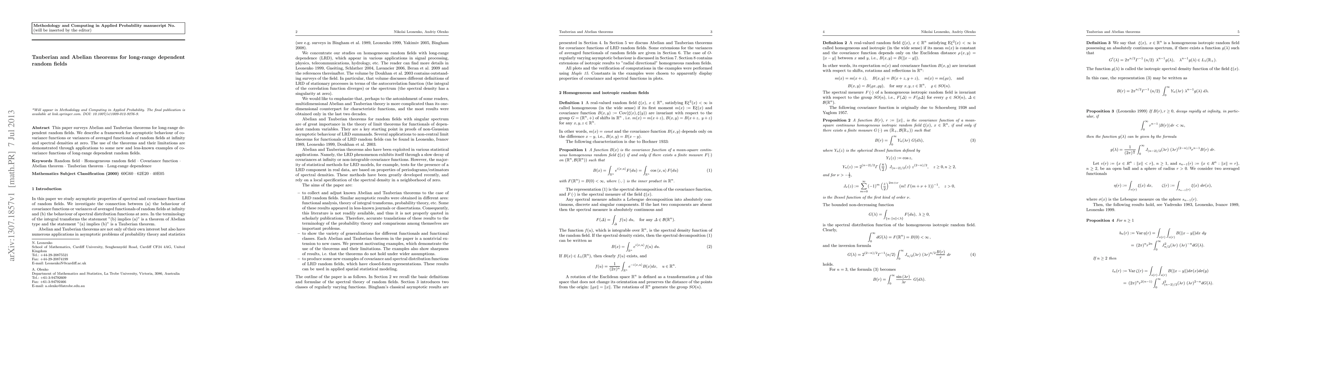 The paper surveys Abelian and Tauberian theorems for long-range dependent random fields, focusing on asymptotic behavior of covariance functions and variances of averaged functionals at infinity and spectral densities at zero.