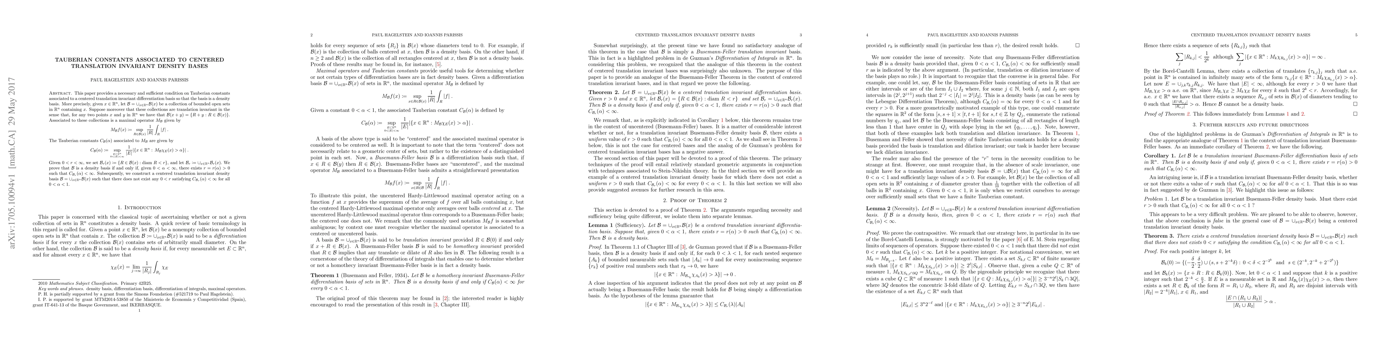 This paper provides a necessary and sufficient condition on Tauberian constants associated to a centered translation invariant differentiation basis so that the basis is a density basis. More precisely, given $x \in \mathbb{R}^n$, let $\mathcal{B} = \cup_{x \in \mathbb{R}^n} \mathcal{B}(x)$ be a collection of bounded open sets in $\mathbb{R}^n$ containing $x$. Suppose moreover that these collections are translation invariant in the sense that, for any two points $x$ and $y$ in $\mathbb{R}^n$ we have that $\mathcal{B}(x + y) = \{R + y : R \in \mathcal{B}(x)\}.$ Associated to these collections is a maximal operator $M_{\mathcal{B}}$ given by $$M_{\mathcal{B}}f(x) :=\sup_{R \in \mathcal{B}(x)} \frac{1}{|R|} \int_R |f|.$$ The Tauberian constants $C_{\mathcal{B}}(\alpha)$ associated to $M_{\mathcal{B}}$ are given by $$C_{\mathcal{B}}(\alpha) :=\sup_{E \subset \mathbb{R}^n \atop 0 < |E| < \infty} \frac{1}{|E|}|\{x \in \mathbb{R}^n :\, M_{\mathcal{B}}\chi_E(x) > \alpha\}|.$$ Given $0 < r < \infty$, we set $\mathcal{B}_r(x) :=\{R \in \mathcal{B}(x) : \mathrm{diam } R < r\}$, and let $\mathcal{B}_r :=\cup_{x \in \mathbb{R}^n} \mathcal{B}_r (x).$ We prove that $\mathcal{B}$ is a density basis if and only if, given $0 < \alpha < \infty$, there exists $ r = r(\alpha) >0$ such that $C_{\mathcal{B}_r}(\alpha) < \infty$. Subsequently, we construct a centered translation invariant density basis $\mathcal{B} = \cup_{x \in \mathbb{R}^n} \mathcal{B}(x)$ such that there does not exist any $0 < r$ satisfying $C_{\mathcal{B}_{r}}(\alpha) < \infty$ for all $0 < \alpha < 1$.