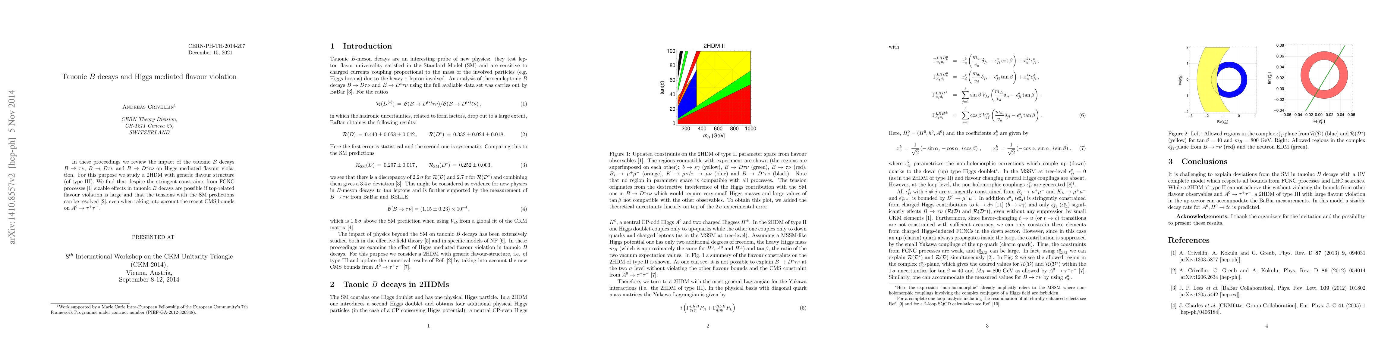 In these proceedings we review the impact of the tauonic $B$ decays $B\to\tau\nu$, $B\to D\tau\nu$ and $B\to D^*\tau\nu$ on Higgs mediated flavour violation. For this purpose we study a 2HDM with generic flavour structure (of type III). We find that despite the stringent constraints from FCNC processes sizable effects in tauonic $B$ decays are possible if top-related flavour violation is large and that the tensions with the SM predictions can be resolved even when taking into account the recent CMS bounds on $A^0\to\tau^+\tau^-$.