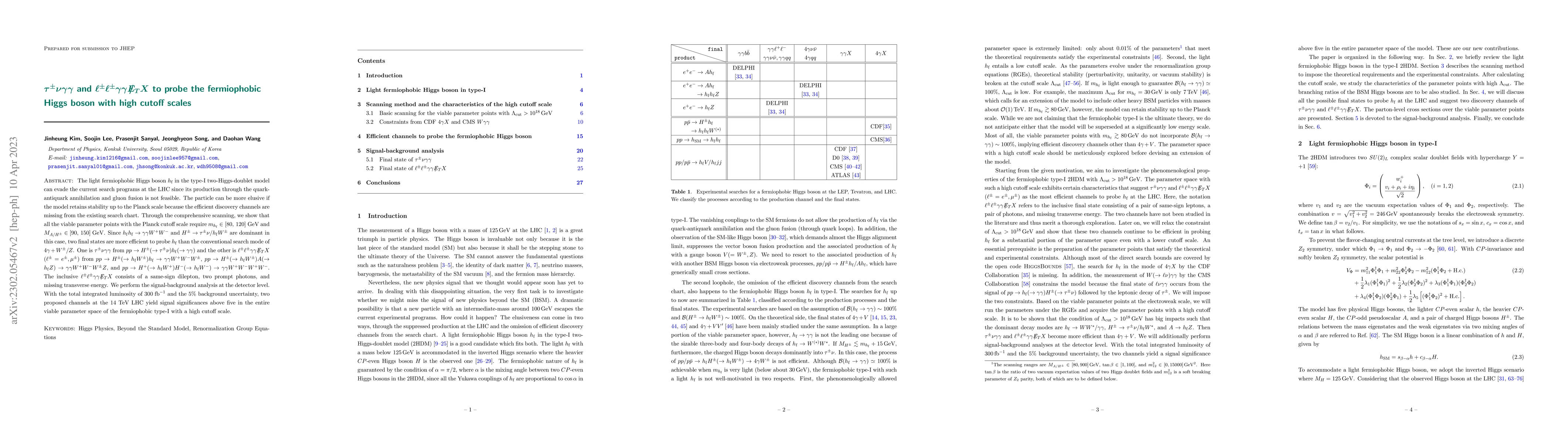 The light fermiophobic Higgs boson $h_{\rm f}$ in the type-I two-Higgs-doublet model can evade the current search programs at the LHC since its production through the quark-antiquark annihilation and gluon fusion is not feasible. The particle can be more elusive if the model retains stability up to the Planck scale because the efficient discovery channels are missing from the existing search chart. Through the comprehensive scanning, we show that all the viable parameter points with the Planck cutoff scale require $ m_{h_{\rm f}} \in[80,\, 120]{\;{\rm GeV}}$ and $M_{A/H^\pm} \in [90,\,150]{\;{\rm GeV}}$. Since $h_{\rm f}h_{\rm f}\to \gamma\gamma W^+ W^-$ and $H^\pm \to \tau^\pm \nu/h_{\rm f}W^\pm$ are dominant in this case, two final states are more efficient to probe $h_{\rm f}$ than the conventional search mode of $4\gamma+W^\pm/Z$. One is $\tau^\pm\nu \gamma\gamma$ from $pp \to H^\pm(\to\tau^\pm\nu) h_{\rm f}(\to \gamma\gamma)$ and the other is $\ell^\pm \ell^\pm \gamma\gamma {\rlap{\,/}{E}_T} X$ ($\ell^\pm=e^\pm,\mu^\pm$) from $pp \to H^\pm(\to h_{\rm f}W^\pm) h_{\rm f} \to \gamma\gamma W^+ W^-W^\pm $, $pp \to H^\pm(\to h_{\rm f} W^\pm) A(\to h_{\rm f} Z) \to \gamma\gamma W^+ W^- W^\pm Z $, and $pp \to H^+(\to h_{\rm f} W^+)H^-(\to h_{\rm f} W^-)\to \gamma\gamma W^+ W^- W^+ W^-$. The inclusive $\ell^\pm \ell^\pm \gamma\gamma {\rlap{\,/}{E}_T} X$ consists of a same-sign dilepton, two prompt photons, and missing transverse energy. We perform the signal-background analysis at the detector level. With the total integrated luminosity of $300\;{\rm fb}^{-1}$ and the 5\% background uncertainty, two proposed channels at the 14 TeV LHC yield signal significances above five in the entire viable parameter space of the fermiophobic type-I with a high cutoff scale.