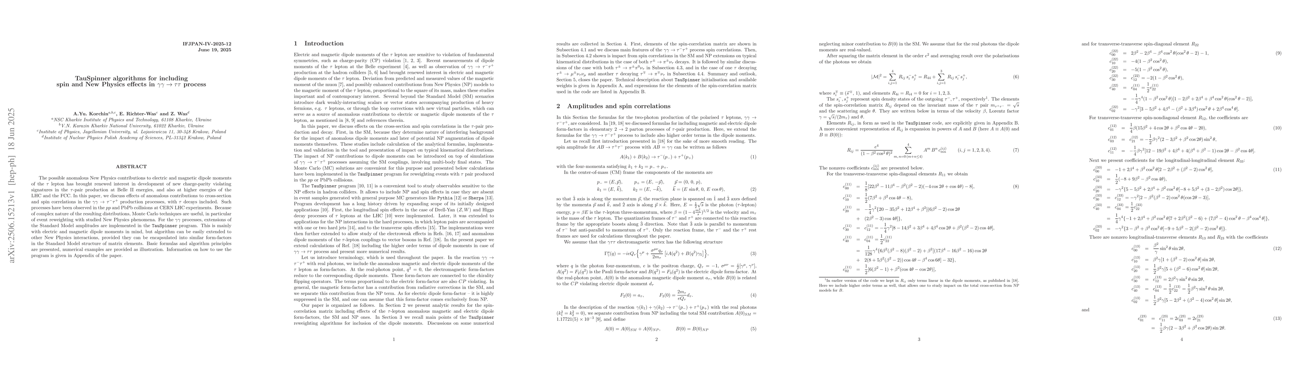 This paper introduces TauSpinner algorithms to incorporate spin and New Physics effects in the gamma-gamma to tau-antitau process. It details how to extend Standard Model amplitudes for anomalous contributions, like those from tau's electric and magnetic dipole moments, using the TauSpinner program. The algorithms can be adapted for other New Physics interactions.