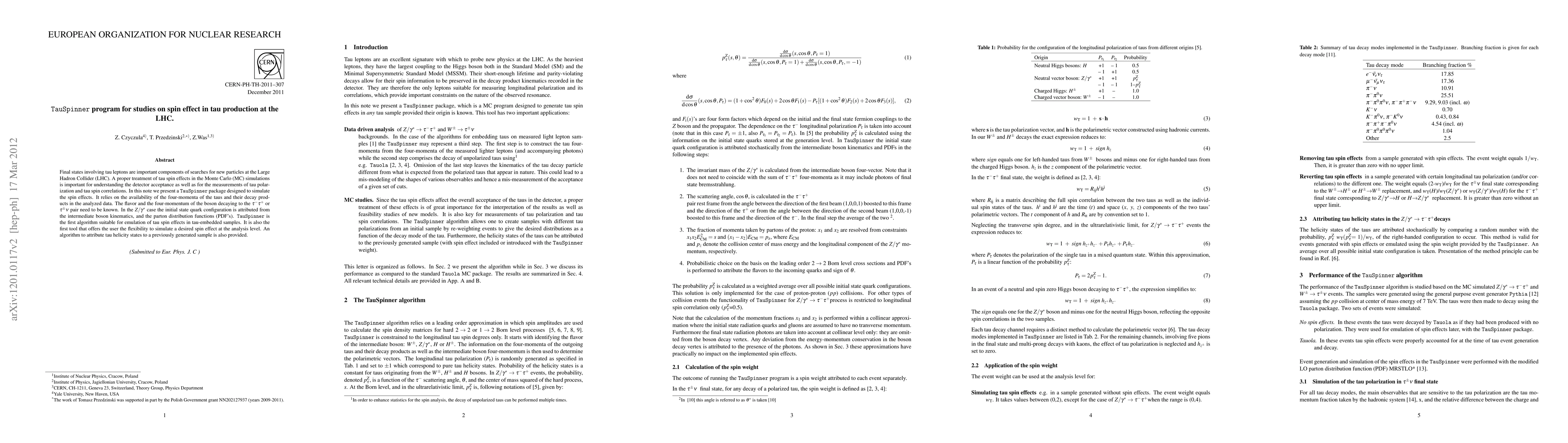 Final states involving tau leptons are important components of searches for new particles at the Large Hadron Collider (LHC). A proper treatment of tau spin effects in the Monte Carlo (MC) simulations is important for understanding the detector acceptance as well as for the measurements of tau polarization and tau spin correlations. In this note we present a TauSpinner package designed to simulate the spin effects. It relies on the availability of the four-momenta of the taus and their decay products in the analyzed data. The flavor and the four-momentum of the boson decaying to the tau-tau+ or tau+- nu pair need to be known. In the Z/gamma* case the initial state quark configuration is attributed from the intermediate boson kinematics, and the parton distribution functions (PDF's). TauSpinner is the first algorithm suitable for emulation of tau spin effects in tau-embedded samples. It is also the first tool that offers the user the flexibility to simulate a desired spin effect at the analysis level. An algorithm to attribute tau helicity states to a previously generated sample is also provided.