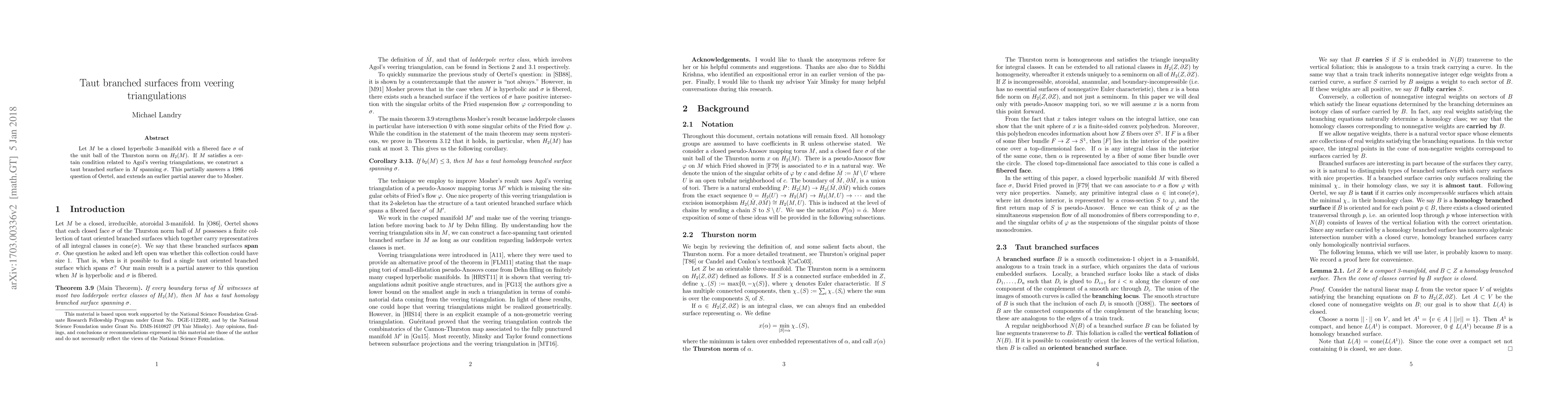 Let $M$ be a closed hyperbolic 3-manifold with a fibered face $\sigma$ of the unit ball of the Thurston norm on $H_2(M)$. If $M$ satisfies a certain condition related to Agol's veering triangulations, we construct a taut branched surface in $M$ spanning $\sigma$. This partially answers a 1985 question of Oertel, and extends an earlier partial answer due to Mosher.
