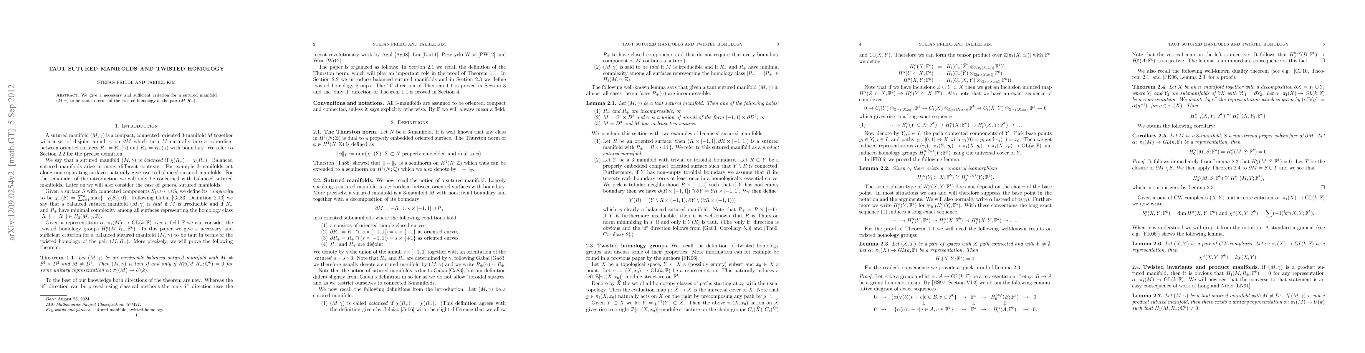 This paper presents a criterion for determining when a sutured manifold is taut, showing that it is equivalent to a specific condition involving the twisted homology of the manifold. The authors provide a clear link between the geometric property of tautness and the algebraic structure of twisted homology.