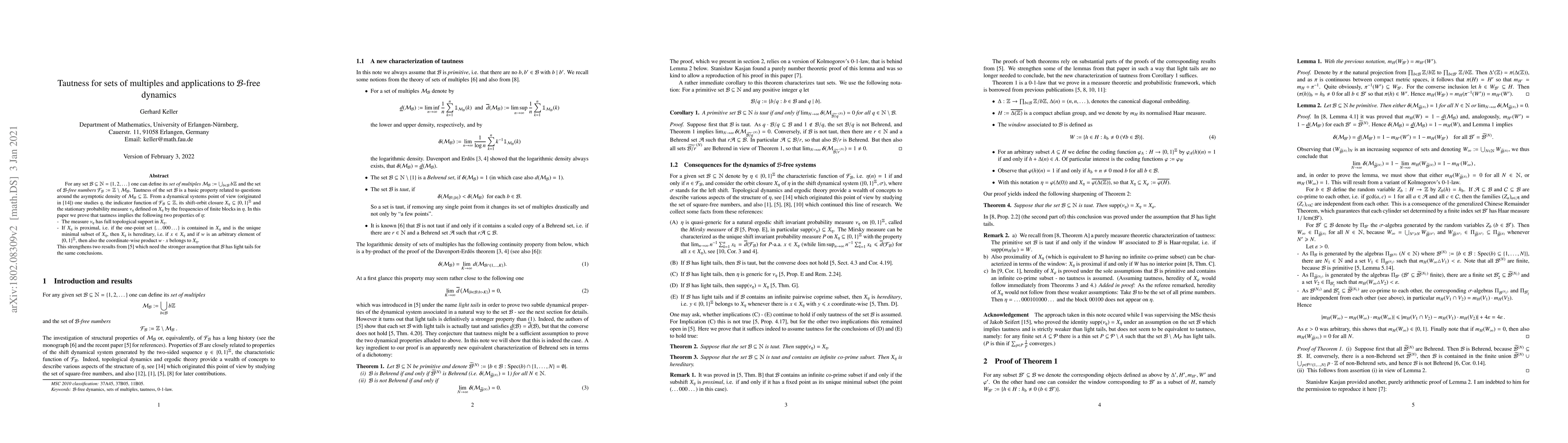 For any set $\mathcal B\subseteq\mathbb N=\{1,2,\dots\}$ one can define its \emph{set of multiples} $\mathcal M_{\mathcal B}:=\bigcup_{b\in\mathcal B}b\mathbb Z$ and the set of \emph{$\mathcal B$-free numbers} $\mathcal F_{\mathcal B}:=\mathbb Z\setminus\mathcal M_{\mathcal B}$. Tautness of the set $\mathcal B$ is a basic property related to questions around the asymptotic density of $\mathcal M_{\mathcal B}\subseteq\mathbb Z$. From a dynamical systems point of view (originated by Sarnak) one studies $\eta$, the indicator function of $\mathcal F_{\mathcal B}\subseteq\mathbb Z$, its shift-orbit closure $X_\eta\subseteq\{0,1\}^{\mathbb Z}$ and the stationary probability measure $\nu_\eta$ defined on $X_\eta$ by the frequencies of finite blocks in $\eta$. In this paper we prove that tautness implies the following two properties of $\eta$: (1) The measure $\nu_\eta$ has full topological support in $X_\eta$. (2) If $X_\eta$ is proximal, i.e. if the one-point set $\{\dots000\dots\}$ is contained in $X_\eta$ and is the unique minimal subset of $X_\eta$, then $X_\eta$ is hereditary, i.e. if $x\in X_\eta$ and if $w$ is an arbitrary element of $\{0,1\}^{\mathbb Z}$, then also the coordinate-wise product $w\cdot x$ belongs to $X_\eta$. This strengthens two results from [Bartnicka et al. 2015] which need the stronger assumption that $\mathcal B$ has light tails for the same conclusions.