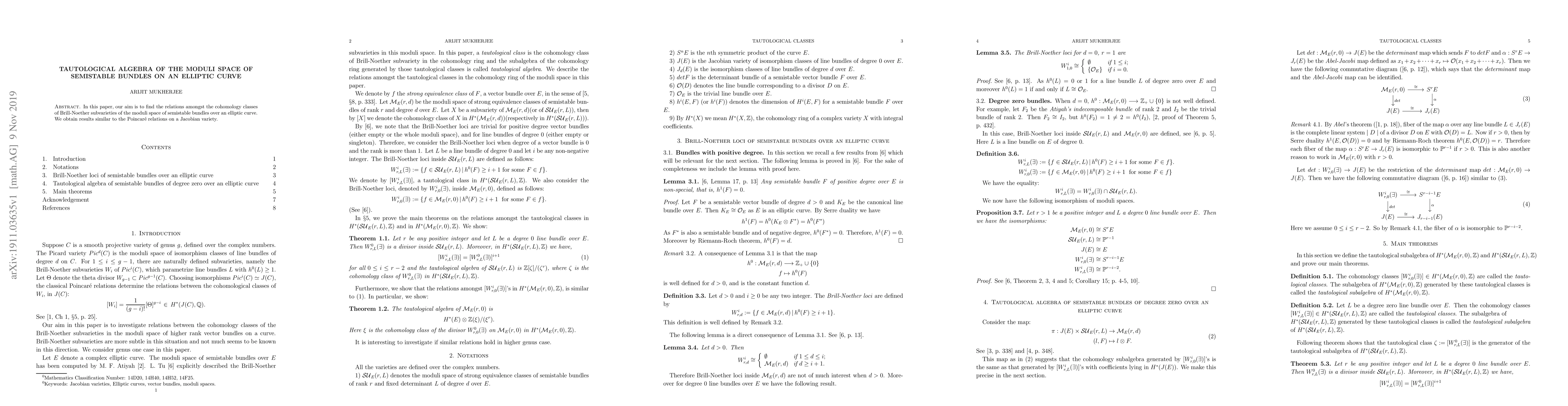 Summary: This paper investigates the cohomology classes of Brill-Noether subvarieties within the moduli space of semistable bundles on an elliptic curve, revealing relations akin to the Poincaré relations found on Jacobian varieties.