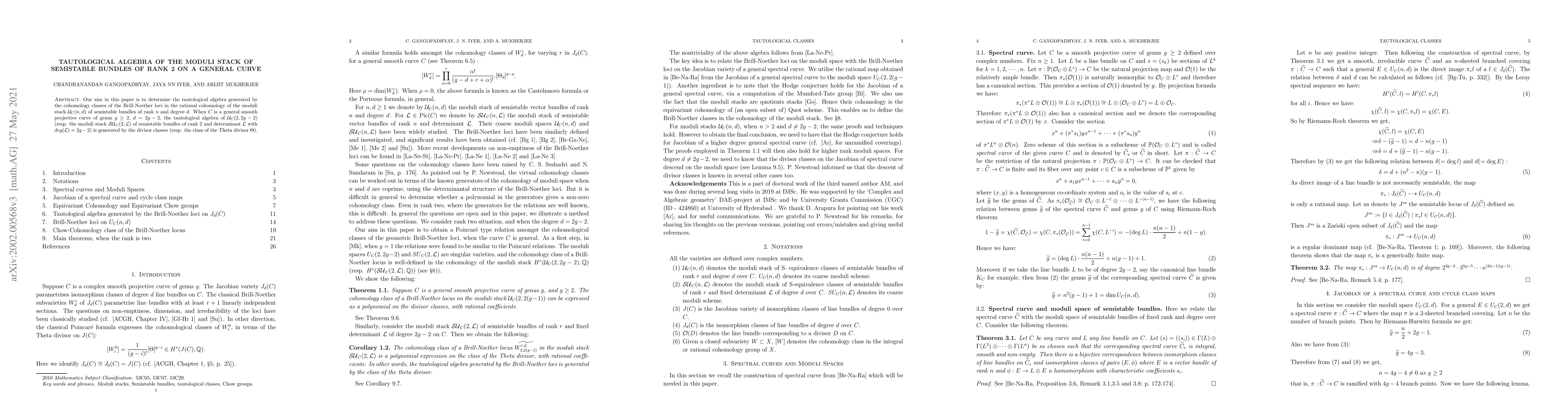 This paper investigates the tautological algebra of the moduli stack of semistable rank-two bundles on a general smooth projective curve, showing that it is generated by cohomology classes of Brill Noether loci. Specifically, for $n=2$ and $d=2g-2$, the algebra is generated by divisor classes or the Theta divisor.