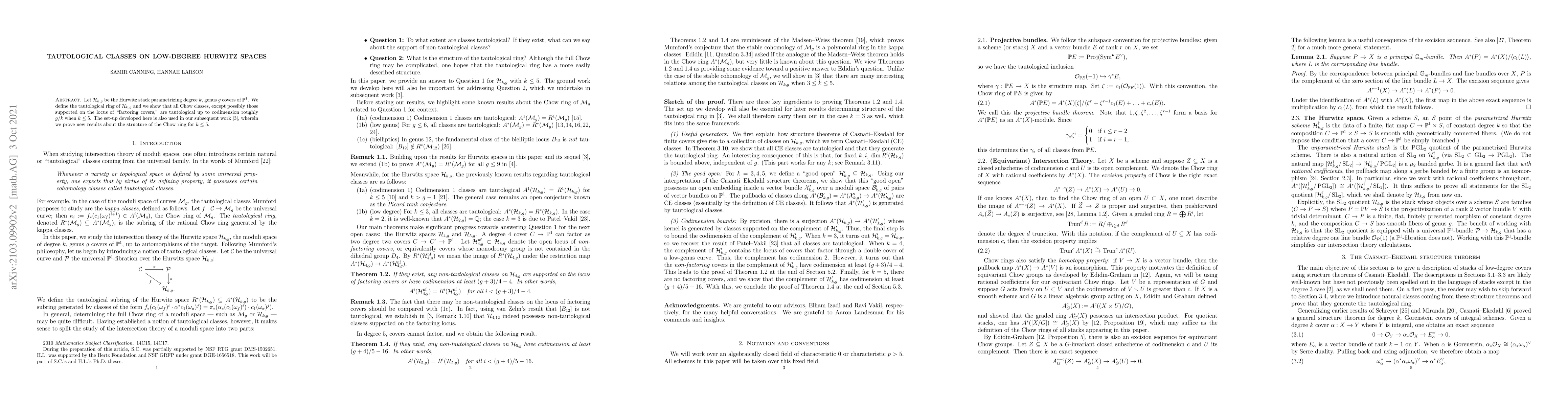 The paper defines the tautological ring of the Hurwitz stack \(\mathcal{H}_{k,g}\) and proves that Chow classes are tautological up to a certain codimension, providing a framework for understanding the Chow rings of low-degree Hurwitz spaces.