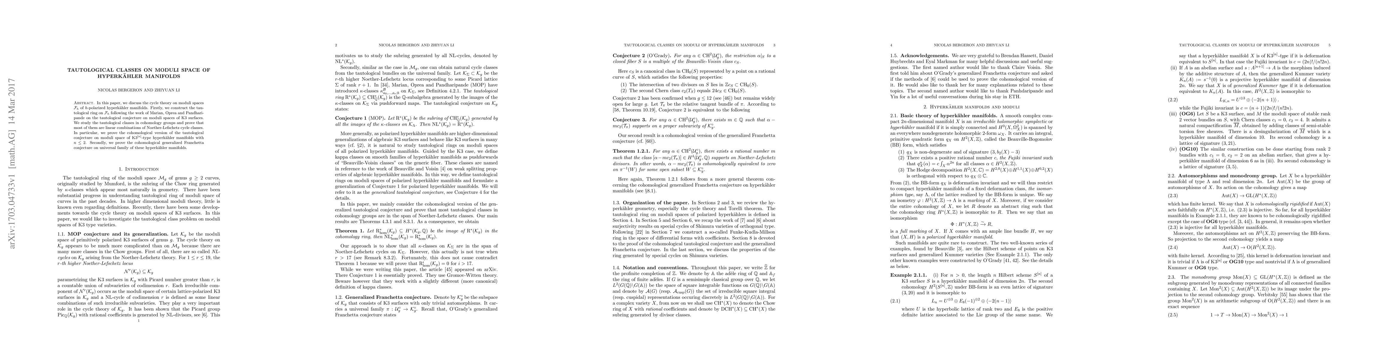 In this paper, we discuss the cycle theory on moduli spaces $\cF_h$ of $h$-polarized hyperk\"ahler manifolds. Firstly, we construct the tautological ring on $\cF_h$ following the work of Marian, Oprea and Pandharipande on the tautological conjecture on moduli spaces of K3 surfaces. We study the tautological classes in cohomology groups and prove that most of them are linear combinations of Noether-Lefschetz cycle classes. In particular, we prove the cohomological version of the tautological conjecture on moduli space of K3$^{[n]}$-type hyperk\"ahler manifolds with $n\leq 2$. Secondly, we prove the cohomological generalized Franchetta conjecture on universal family of these hyperk\"ahler manifolds.