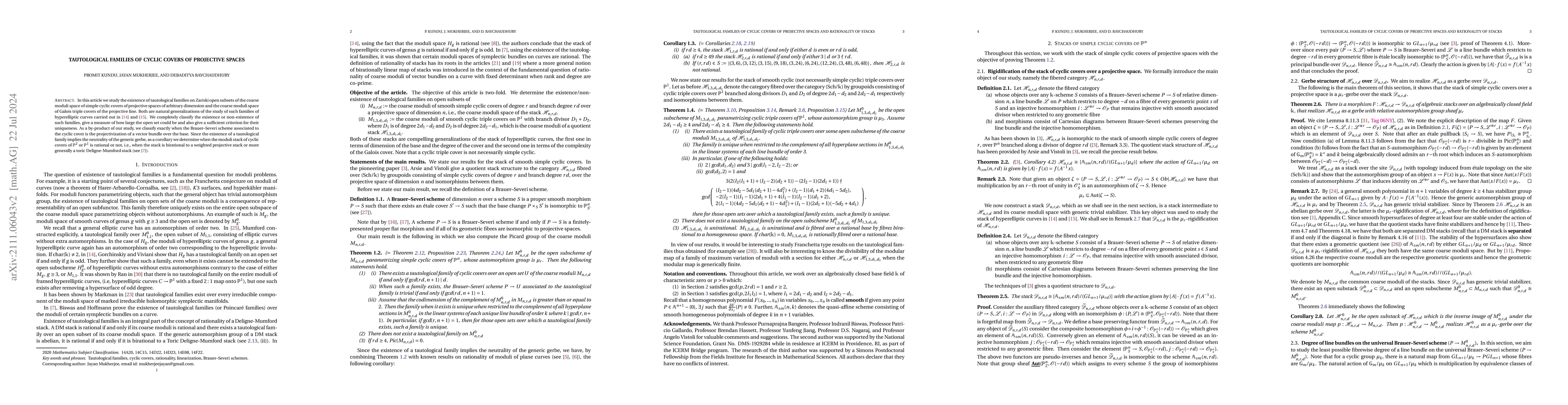 This paper investigates the existence of tautological families on moduli spaces parametrizing cyclic covers of projective spaces, showing that such families exist under specific conditions and discussing their extension possibilities. It determines the rationality of certain stacks and moduli spaces, particularly for cyclic covers of $\mathbb{P}^1$ and $\mathbb{P}^2$, and establishes that $\mathscr{H}_{1,3,d_1,d_2}$ is unirational with rational coarse moduli under certain characteristics.