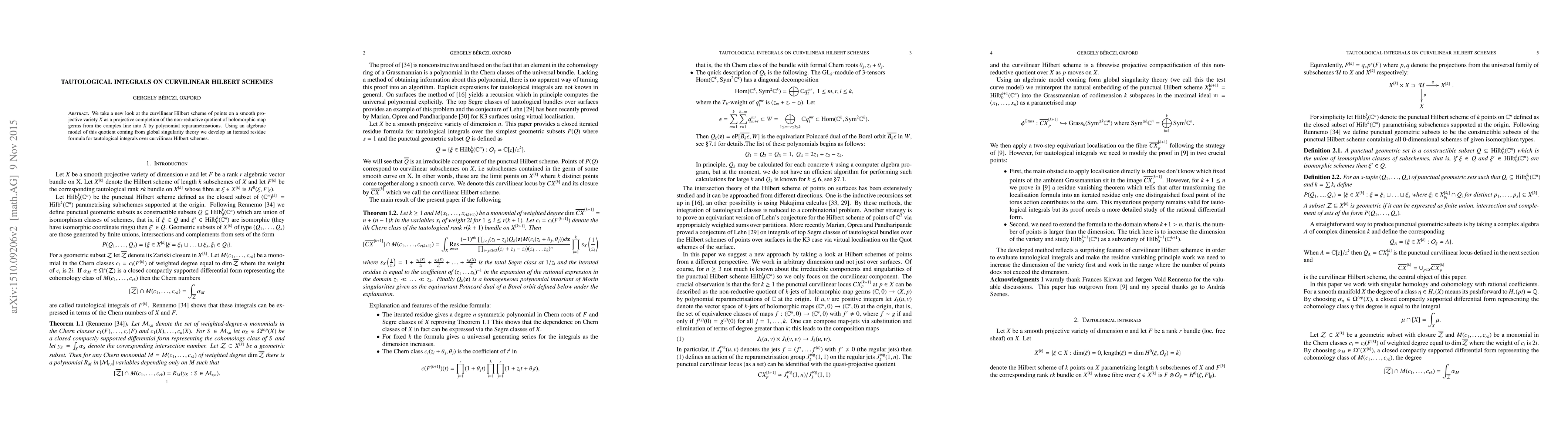 This paper introduces a projective completion approach to curvilinear Hilbert schemes on smooth projective varieties, deriving an iterated residue formula for tautological integrals via an algebraic model from global singularity theory.