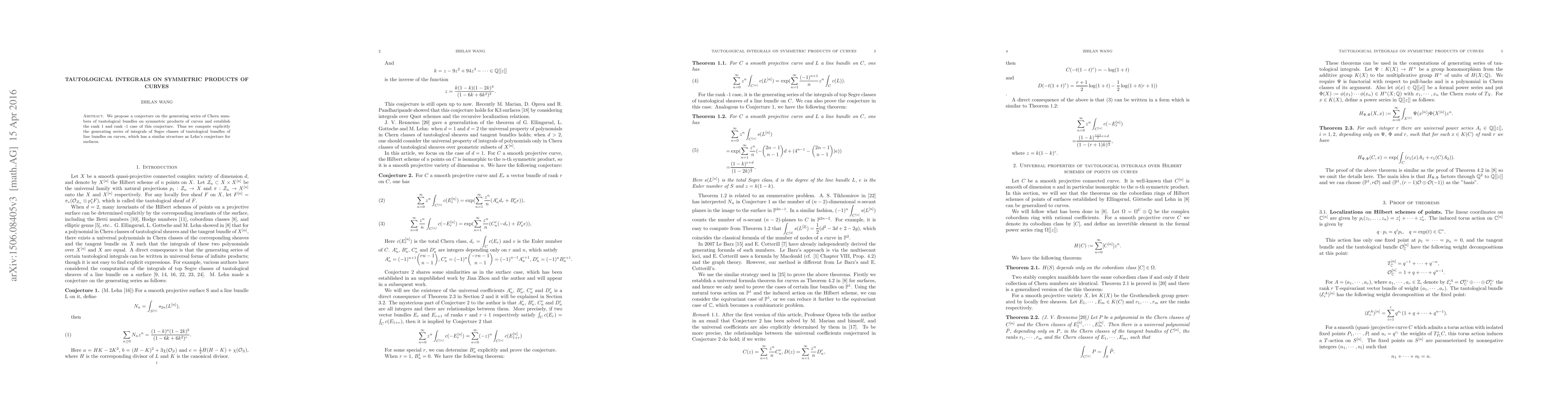 This paper proposes a conjecture on the generating series of Chern numbers for tautological bundles on Hilbert schemes of points on curves, and verifies this conjecture for rank 1 and rank -1 cases. It explicitly computes the generating series of Segre class integrals, mirroring Lehn's conjecture for surfaces.