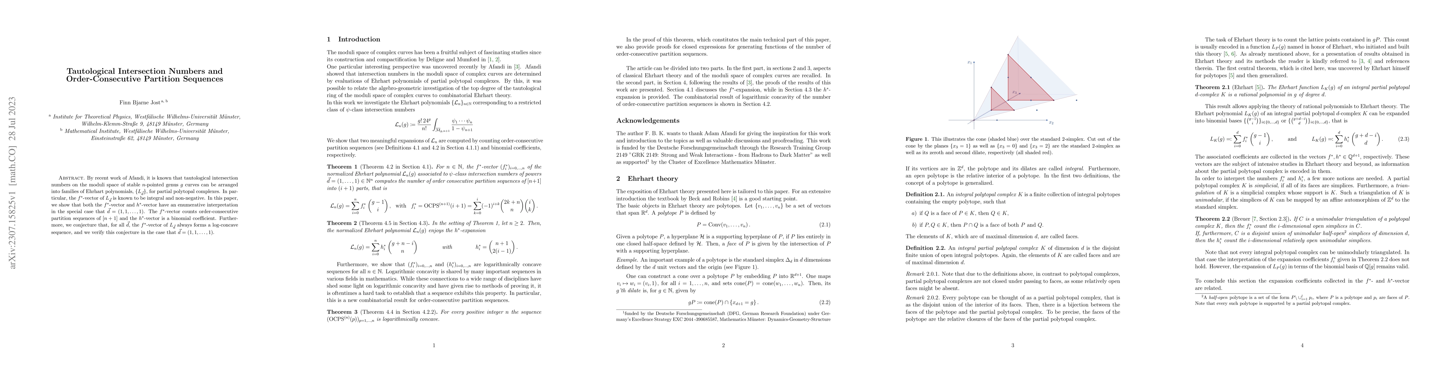 This paper explores the enumeration of tautological intersection numbers on moduli spaces, showing that for $\vec{d} = (1, 1, \dots, 1)$, the $f^*$-vector counts order-consecutive partition sequences, while the $h^*$-vector is a binomial coefficient, and verifies a log-concavity conjecture for this specific case.