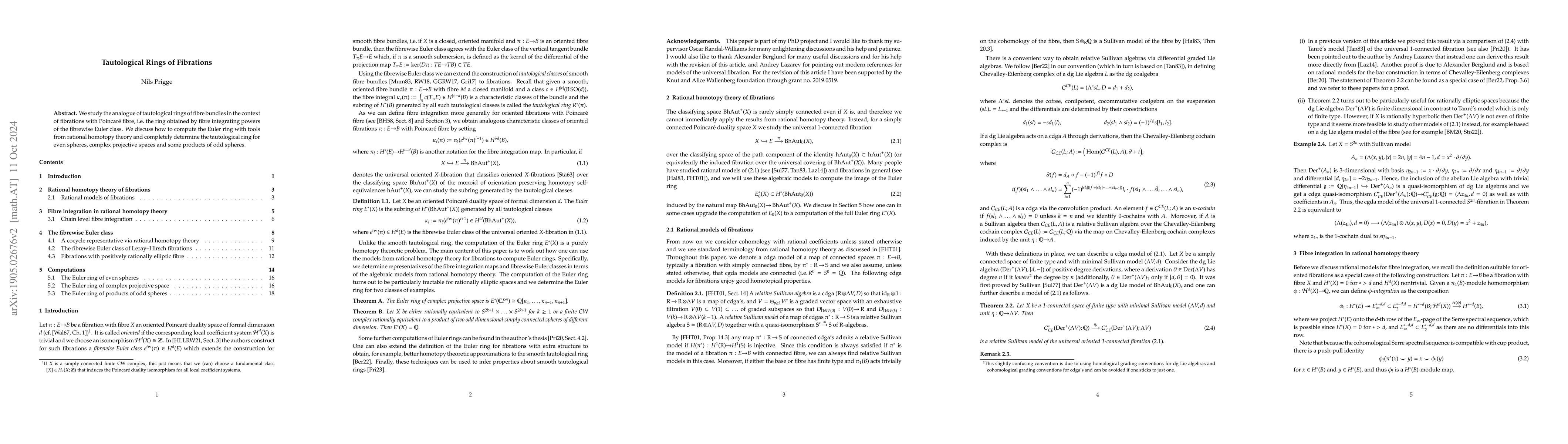 We study the analogue of tautological rings of fibre bundles in the context of fibrations with Poincar\'e fibre, i.e. the ring obtained by fibre integrating powers of the fibrewise Euler class. We approach this ring of characteristic classes using rational homotopy theory. More specifically, we discuss a cdga model for the universal fibration and chain level representatives of fibre integration and the fibrewise Euler class. This is particularly useful for rationally elliptic spaces and as an example we compute the tautological ring for complex projective spaces and products of odd spheres.