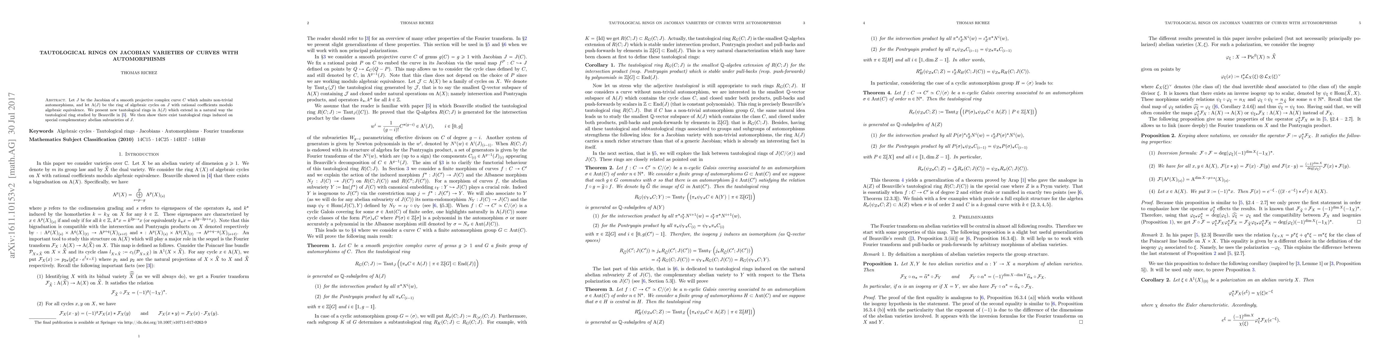 Let $J$ be the Jacobian of a smooth projective complex curve $C$ which admits non-trivial automorphisms, and let $A(J)$ be the ring of algebraic cycles on $J$ with rational coefficients modulo algebraic equivalence. We present new tautological rings in $A(J)$ which extend in a natural way the tautological ring studied by Beauville (Compos Math 140(3):683-688, 2004). We then show there exist tautological rings induced on special complementary abelian subvarieties of $J$.