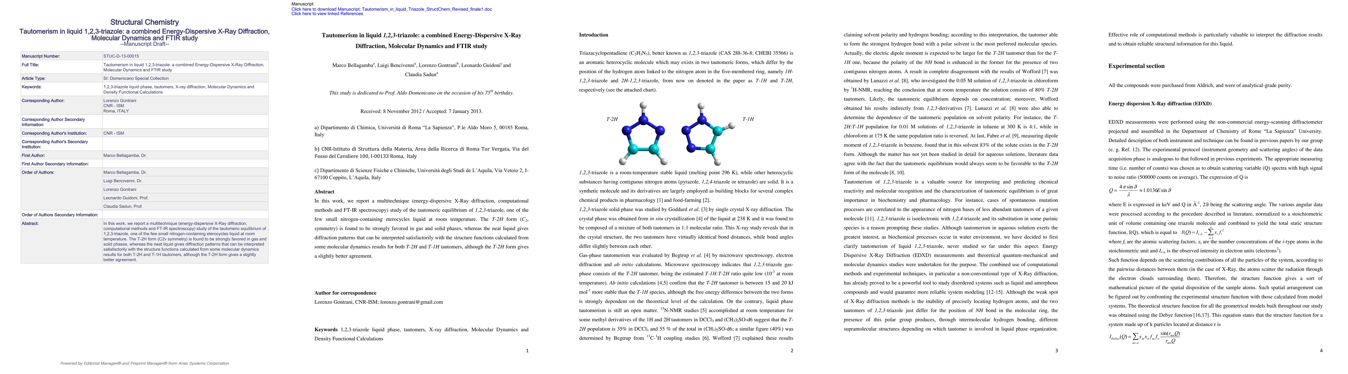 This study combines energy-dispersive X-Ray diffraction, molecular dynamics, and FTIR spectroscopy to investigate the tautomerism of liquid 1,2,3-triazole, finding that the T-2H form is favored in gas and solid phases, while both tautomers are present in the liquid state, with T-2H showing slightly better agreement in diffraction patterns.