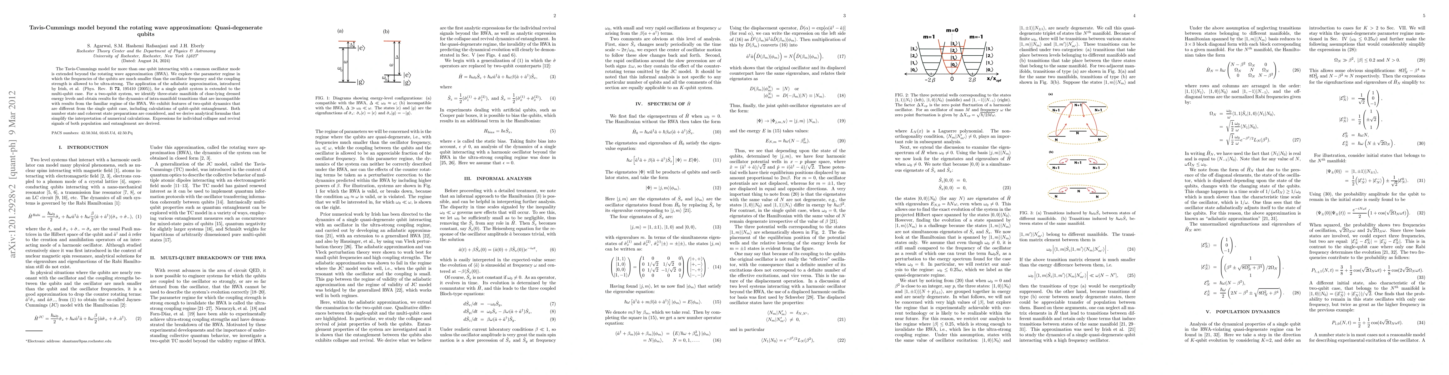 This paper extends the Tavis-Cummings model beyond the rotating wave approximation to study multi-qubit systems interacting with a common oscillator, focusing on quasi-degenerate qubits. It introduces an adiabatic approximation to explore ultra-strong coupling scenarios, revealing distinct dynamics and entanglement features not captured by the RWA.