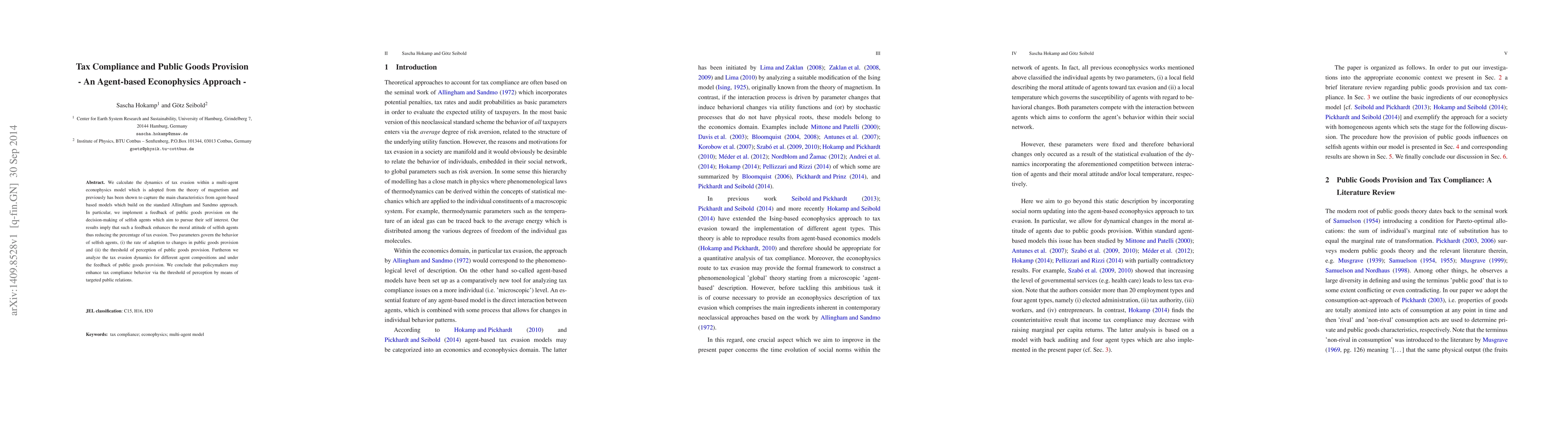 This paper explores tax evasion dynamics using an agent-based econophysics model inspired by magnetism, showing that public goods provision can reduce tax evasion by enhancing agents' moral attitudes. The study identifies two key parameters influencing agent behavior and suggests that targeted public relations can improve tax compliance.