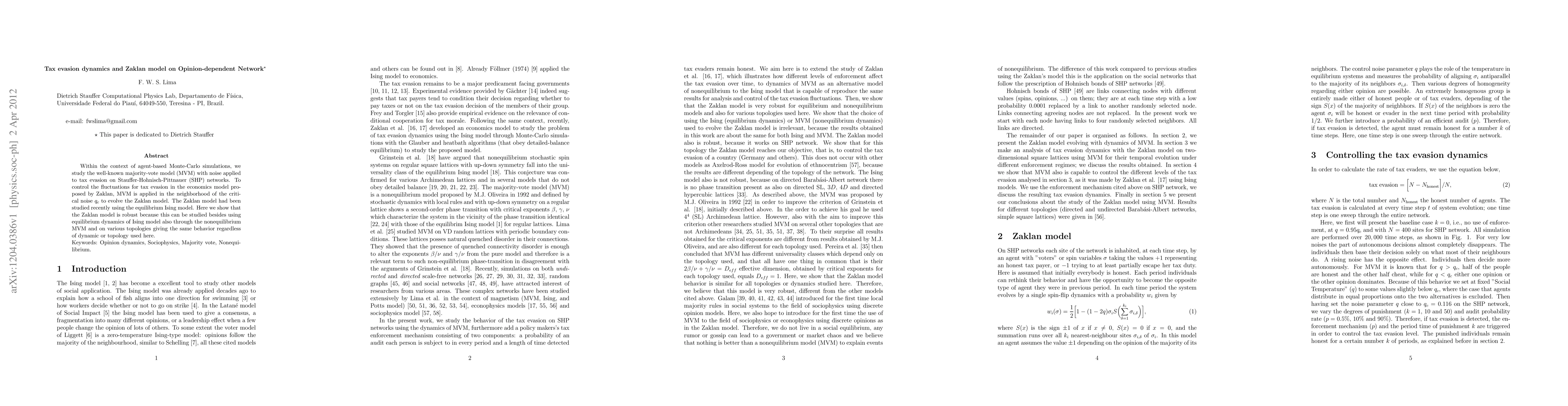 This paper uses agent-based Monte-Carlo simulations to study tax evasion dynamics on Stauffer-Hohnisch-Pittnauer (SHP) networks, applying the majority-vote model (MVM) with noise. The Zaklan model's robustness is demonstrated through nonequilibrium MVM dynamics, showing consistent behavior across different network topologies.