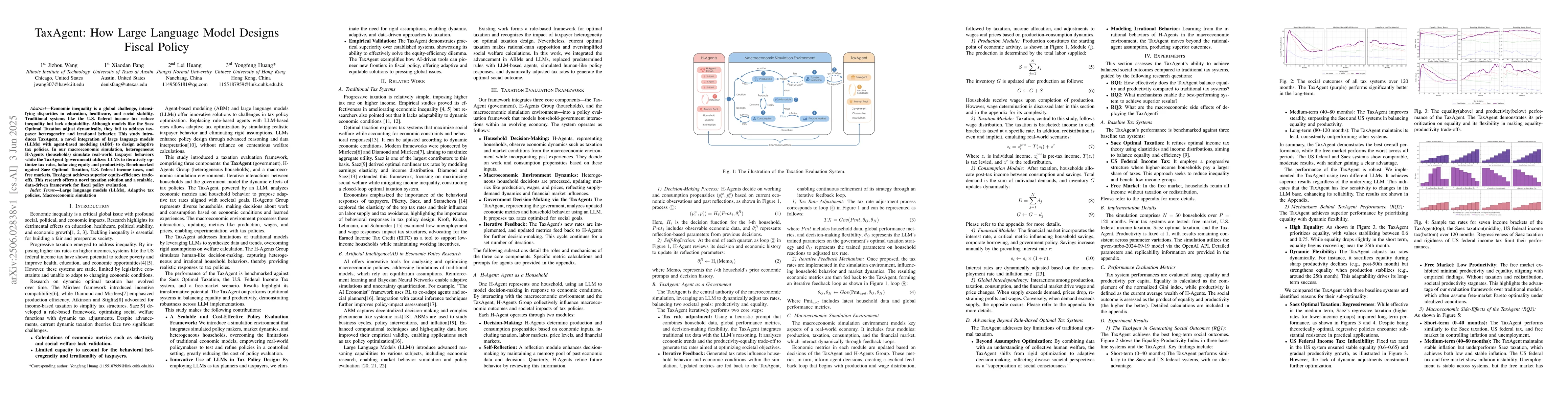 The research introduces TaxAgent, a system that combines large language models (LLMs) with agent-based modeling (ABM) to design adaptive tax policies. Heterogeneous H-Agents simulate real-world taxpayer behaviors, while TaxAgent uses LLMs to iteratively optimize tax rates, balancing equity and productivity.