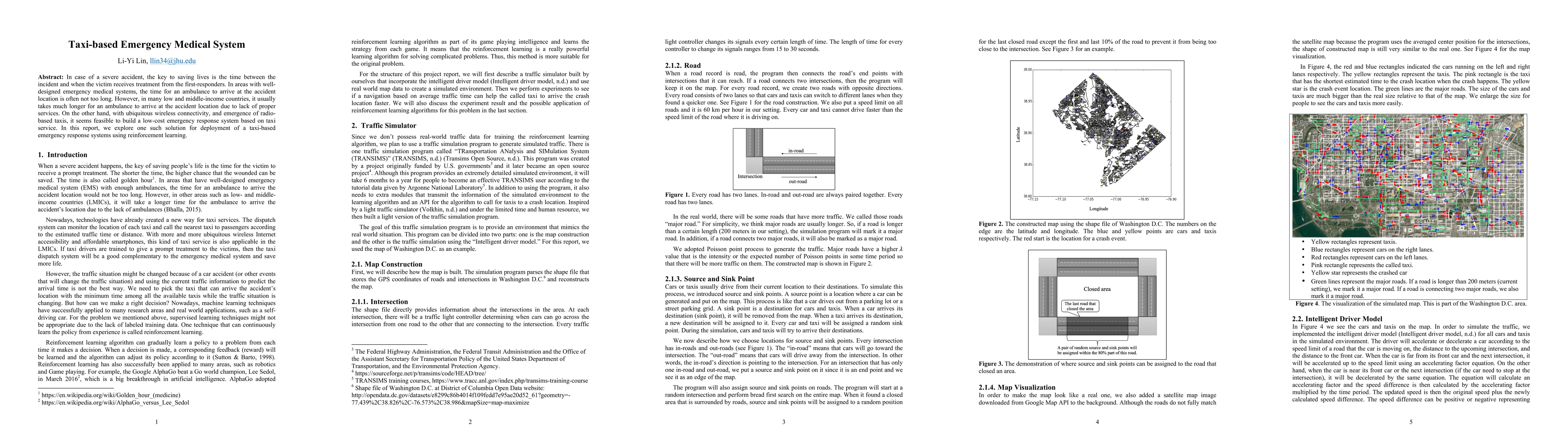 In case of a severe accident, the key to saving lives is the time between the incident and when the victim receives treatment from the first-responders. In areas with well designed emergency medical systems, the time for an ambulance to arrive at the accident location is often not too long. However, in many low and middle income countries, it usually takes much longer for an ambulance to arrive at the accident location due to lack of proper services. On the other hand, with ubiquitous wireless connectivity, and emergence of radio based taxis, it seems feasible to build a low-cost emergency response system based on taxi service. In this report, we explore one such solution for deployment of a taxi-based emergency response systems using reinforcement learning.