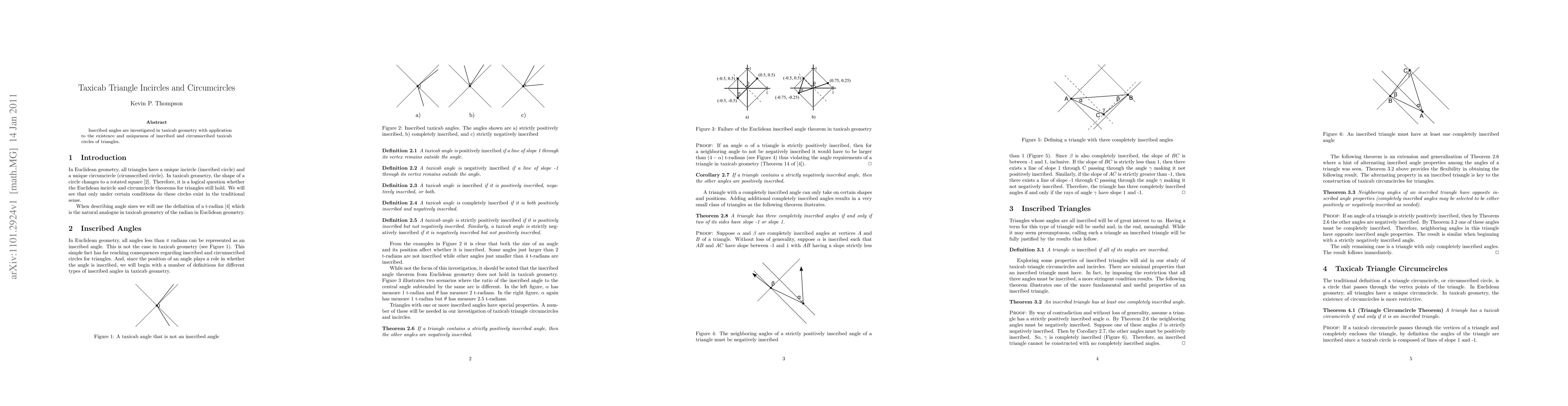 The paper investigates inscribed angles in taxicab geometry, focusing on the existence and uniqueness of inscribed and circumscribed taxicab circles for triangles.
