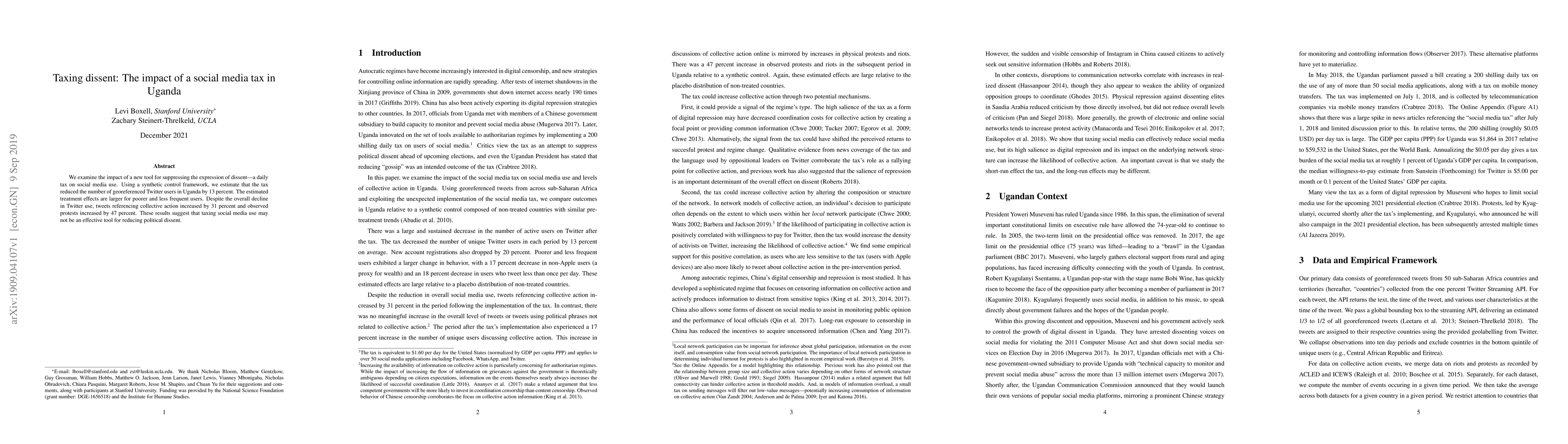 We examine the impact of a new tool for suppressing the expression of dissent---a daily tax on social media use. Using a synthetic control framework, we estimate that the tax reduced the number of georeferenced Twitter users in Uganda by 13 percent. The estimated treatment effects are larger for poorer and less frequent users. Despite the overall decline in Twitter use, tweets referencing collective action increased by 31 percent and observed protests increased by 47 percent. These results suggest that taxing social media use may not be an effective tool for reducing political dissent.