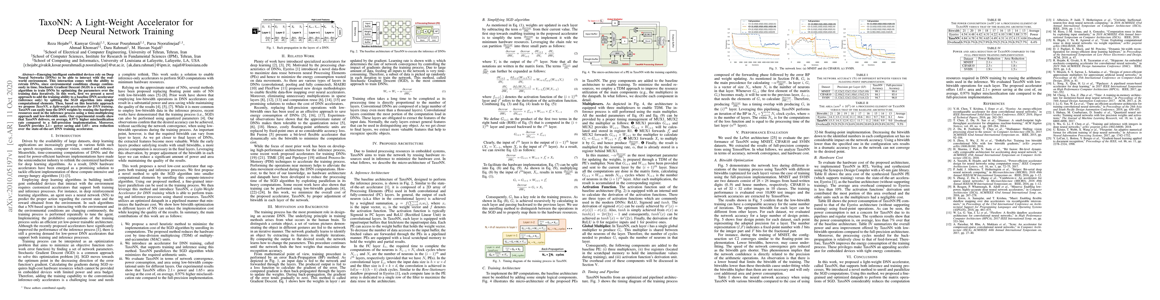 TaxoNN introduces a light-weight accelerator for training Deep Neural Networks (DNNs) by splitting Stochastic Gradient Descent into simple computational elements, achieving 2.1× power savings and 1.65× area reduction compared to existing solutions, while maintaining a 0.97% higher misclassification rate.