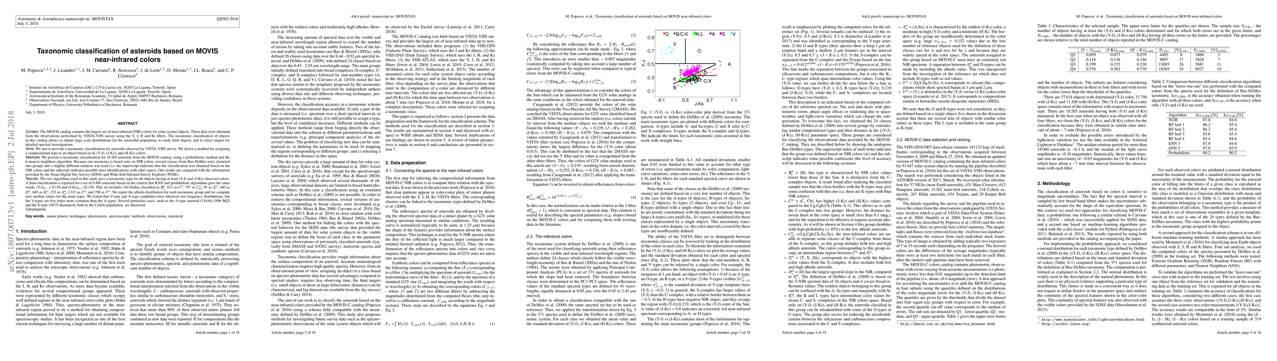 This paper presents a taxonomic classification of 18,265 asteroids using near-infrared colors from the MOVIS catalog, employing a probabilistic method and k-nearest neighbors algorithm. The study reports a refined classification scheme based on NIR colors, with a final classification for 6,496 asteroids where both methods agreed, revealing new median values and albedo distributions for each type.