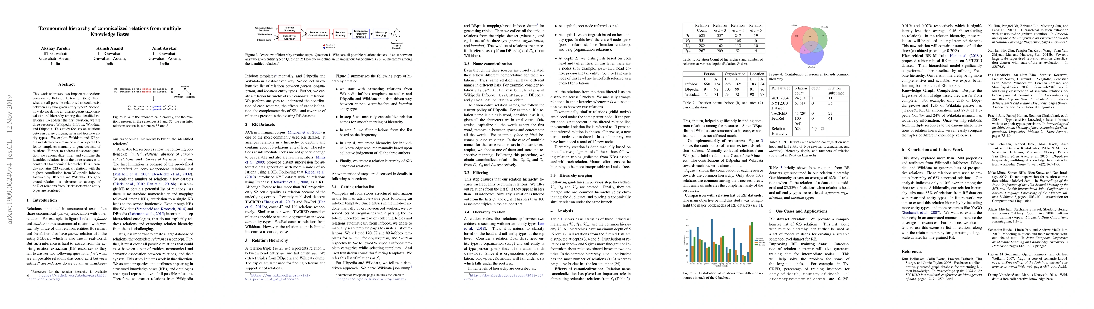 This work addresses two important questions pertinent to Relation Extraction (RE). First, what are all possible relations that could exist between any two given entity types? Second, how do we define an unambiguous taxonomical (is-a) hierarchy among the identified relations? To address the first question, we use three resources Wikipedia Infobox, Wikidata, and DBpedia. This study focuses on relations between person, organization and location entity types. We exploit Wikidata and DBpedia in a data-driven manner, and Wikipedia Infobox templates manually to generate lists of relations. Further, to address the second question, we canonicalize, filter, and combine the identified relations from the three resources to construct a taxonomical hierarchy. This hierarchy contains 623 canonical relations with highest contribution from Wikipedia Infobox followed by DBpedia and Wikidata. The generated relation list subsumes an average of 85% of relations from RE datasets when entity types are restricted.