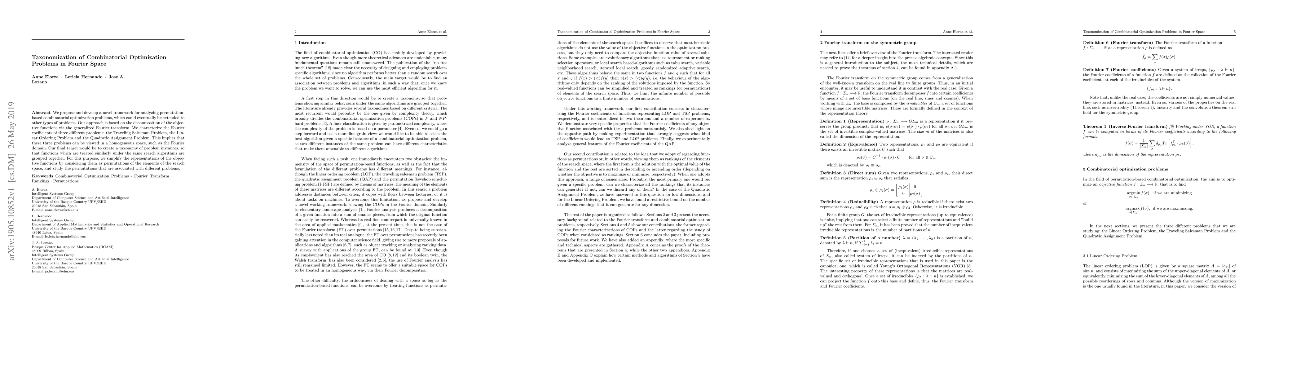 We propose and develop a novel framework for analyzing permutation-based combinatorial optimization problems, which could eventually be extended to other types of problems. Our approach is based on the decomposition of the objective functions via the generalized Fourier transform. We characterize the Fourier coefficients of three different problems: the Traveling Salesman Problem, the Linear Ordering Problem and the Quadratic Assignment Problem. This implies that these three problems can be viewed in a homogeneous space, such as the Fourier domain. Our final target would be to create a taxonomy of problem instances, so that functions which are treated similarly under the same search algorithms are grouped together. For this purpose, we simplify the representations of the objective functions by considering them as permutations of the elements of the search space, and study the permutations that are associated with different problems.