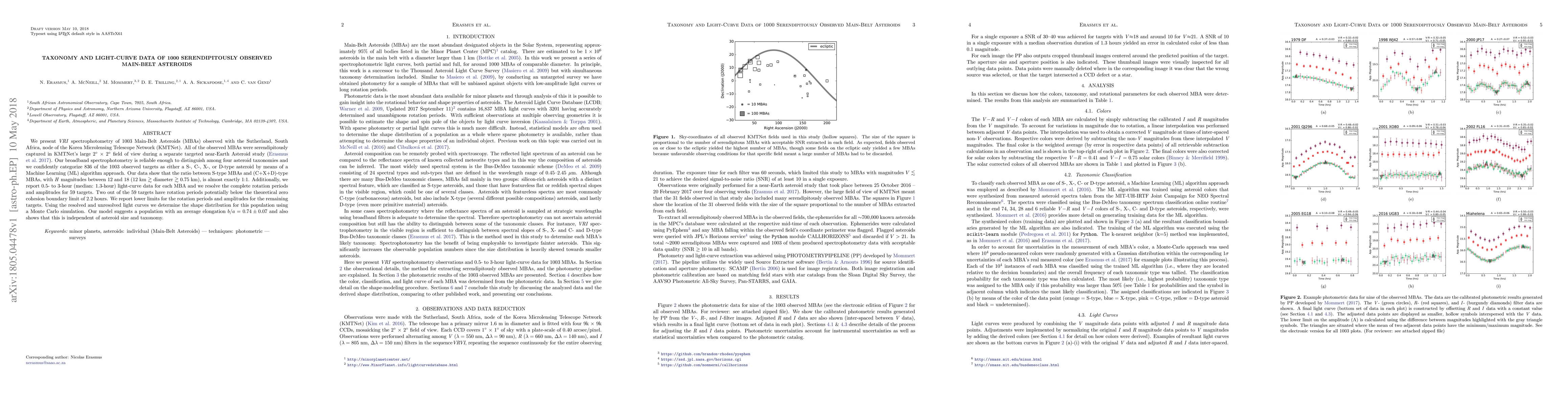 We present VRI spectrophotometry of 1003 Main-Belt Asteroids (MBAs) observed with the Sutherland, South Africa, node of the Korea Microlensing Telescope Network (KMTNet). All of the observed MBAs were serendipitously captured in KMTNet's large 2deg $\times$ 2deg field of view during a separate targeted near-Earth Asteroid study (Erasmus et al. 2017). Our broadband spectrophotometry is reliable enough to distinguish among four asteroid taxonomies and we confidently categorize 836 of the 1003 observed targets as either a S-, C-, X-, or D-type asteroid by means of a Machine Learning (ML) algorithm approach. Our data show that the ratio between S-type MBAs and (C+X+D)-type MBAs, with H magnitudes between 12 and 18 (12 km $\gtrsim$ diameter $\gtrsim$ 0.75 km), is almost exactly 1:1. Additionally, we report 0.5- to 3-hour (median: 1.3-hour) light-curve data for each MBA and we resolve the complete rotation periods and amplitudes for 59 targets. Two out of the 59 targets have rotation periods potentially below the theoretical zero cohesion boundary limit of 2.2 hours. We report lower limits for the rotation periods and amplitudes for the remaining targets. Using the resolved and unresolved light curves we determine the shape distribution for this population using a Monte Carlo simulation. Our model suggests a population with an average elongation $b/a = 0.74\pm0.07$ and also shows that this is independent of asteroid size and taxonomy.