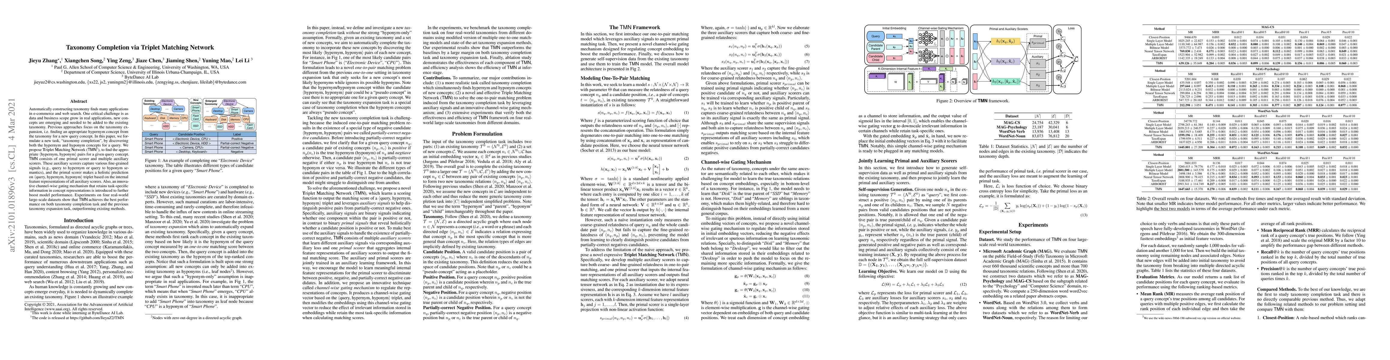 A new method called Triplet Matching Network (TMN) improves taxonomy completion by discovering both hypernym and hyponym concepts for a query concept, outperforming existing methods on four large-scale datasets.